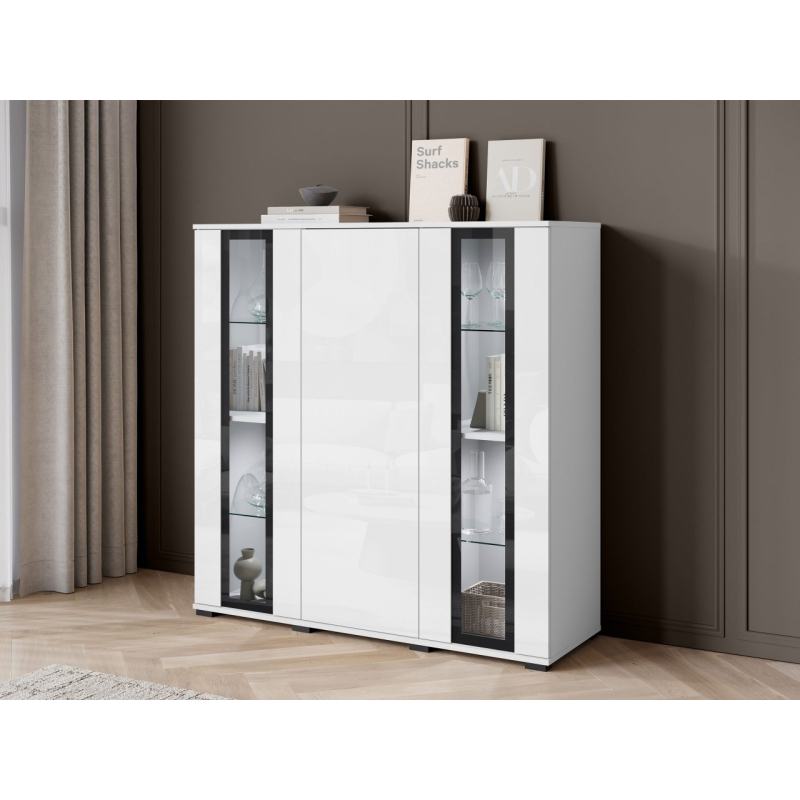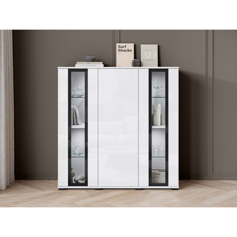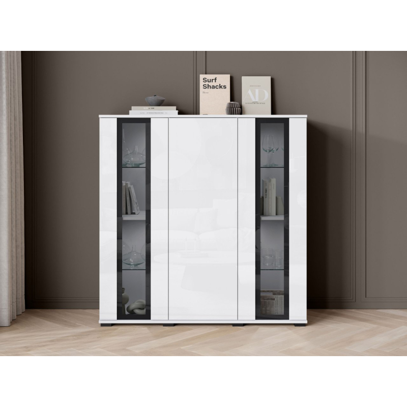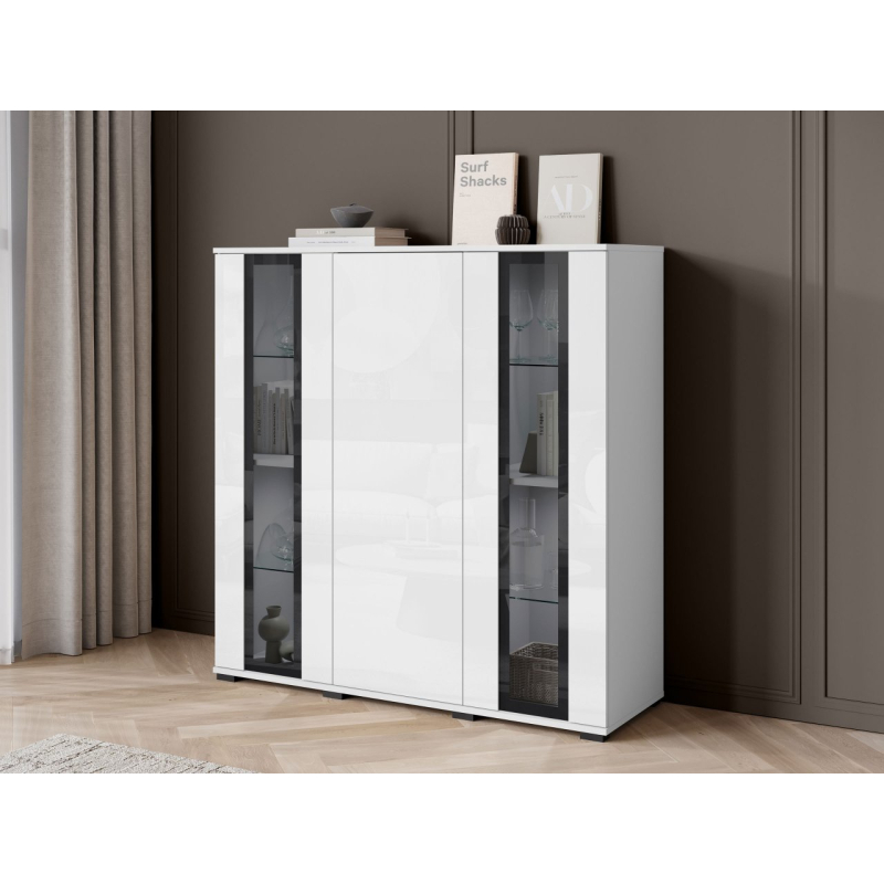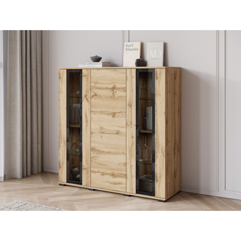 Za masivními čelami se nachází velký úložný prostor v podobě tří polic. Ideální pro udržení pořádku v obývacím pokoji, jídelně nebo kanceláři. Komoda s vitrínou je k dispozici v několika pečlivě vybraných barvách, takže ji snadno sladíte se stylem vašeho interiéru.