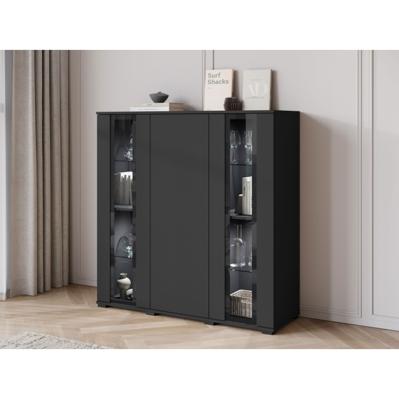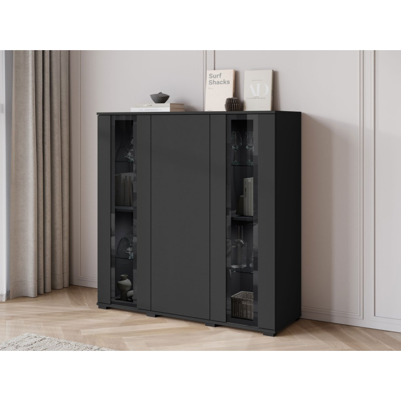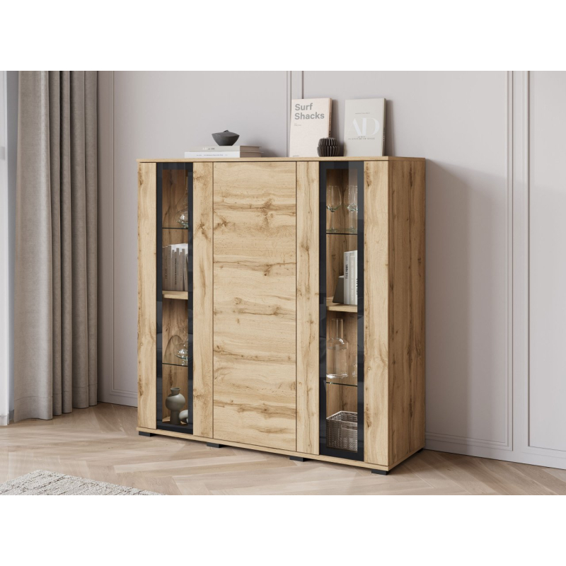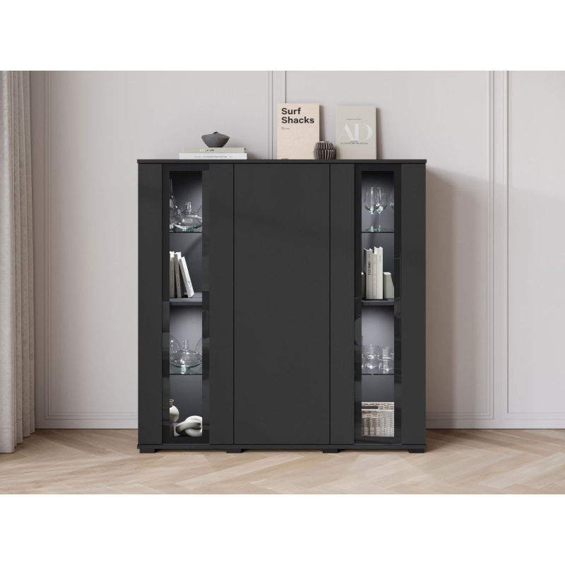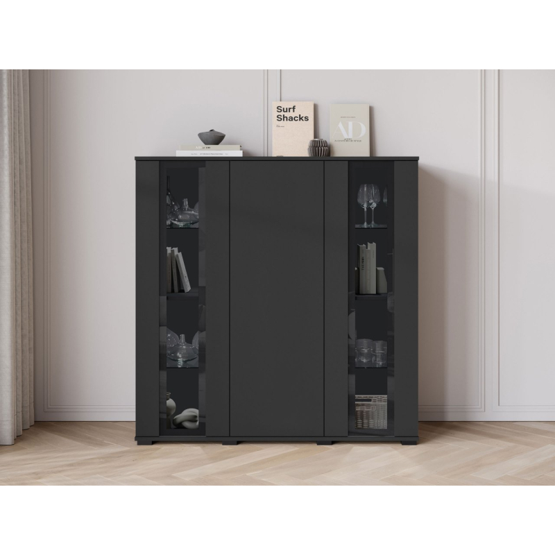 Vyvážený design komody Hedvis HB 120 do obývacího pokoje přitahuje pozornost a dodává interiéru noblesu. Prosklené vitríny jsou ideálním místem pro vystavení dekorací, knih nebo skla. Vertikální skleněné panely zdůrazňují moderní charakter nábytku.