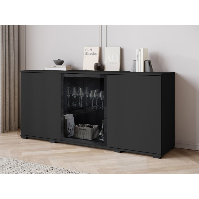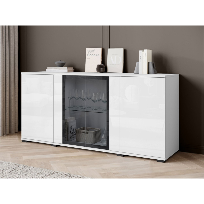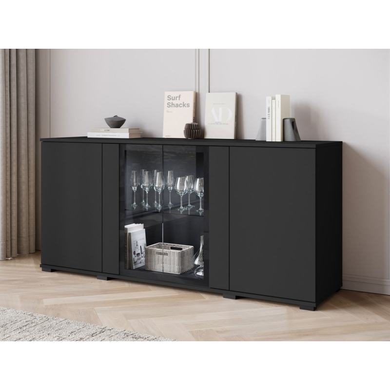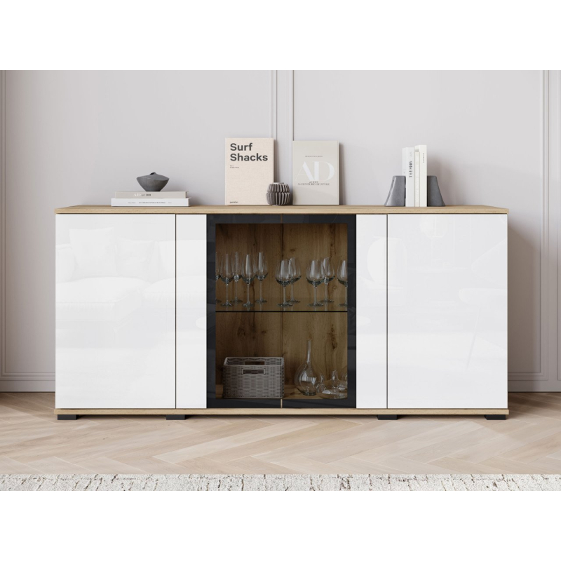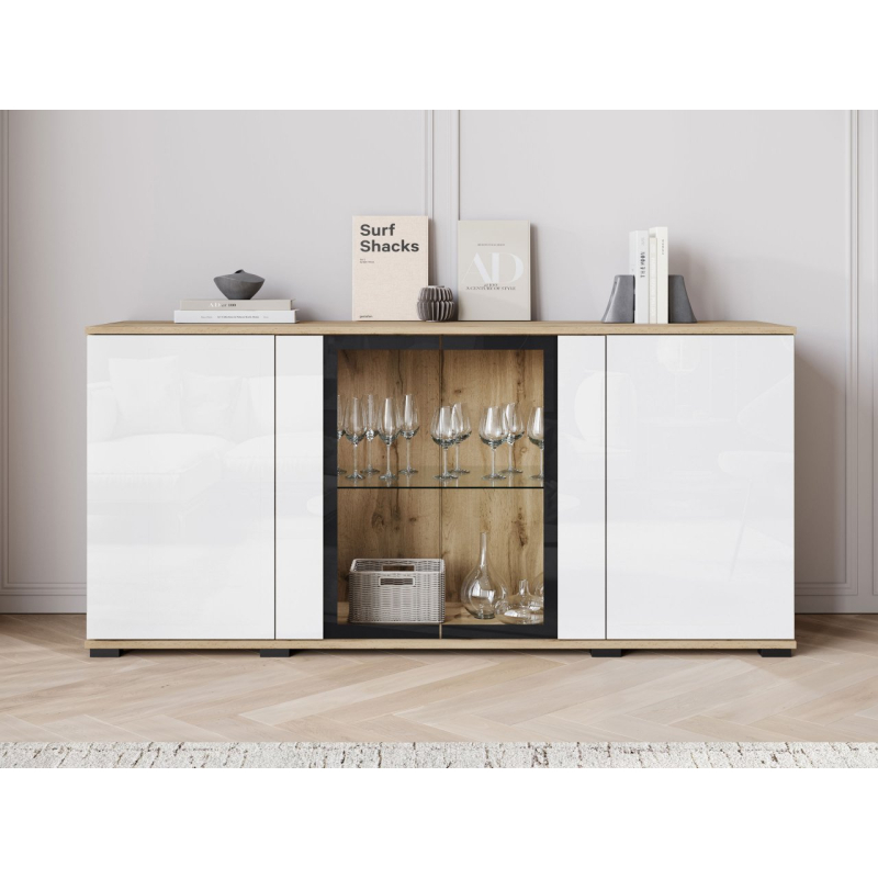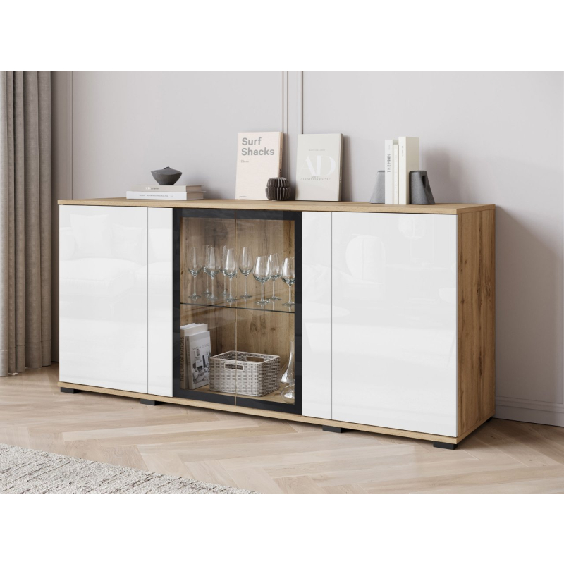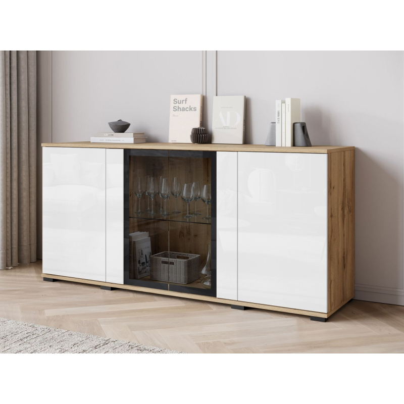 Elegantní a uspořádaný interiér vám poskytne komoda Hedvis SB 154 4D. Minimalistický tvar poskytuje jedinečný vzhled a zároveň spoustu prostoru pro organizaci. Za dvířky se nacházejí prostorné police, do kterých si můžete uložit nádobí, dokumenty nebo jiné předměty. Široká komoda má také skleněné dvířka, za kterými skvěle vypadají šálky, sklenice na víno nebo tematické dekorace.