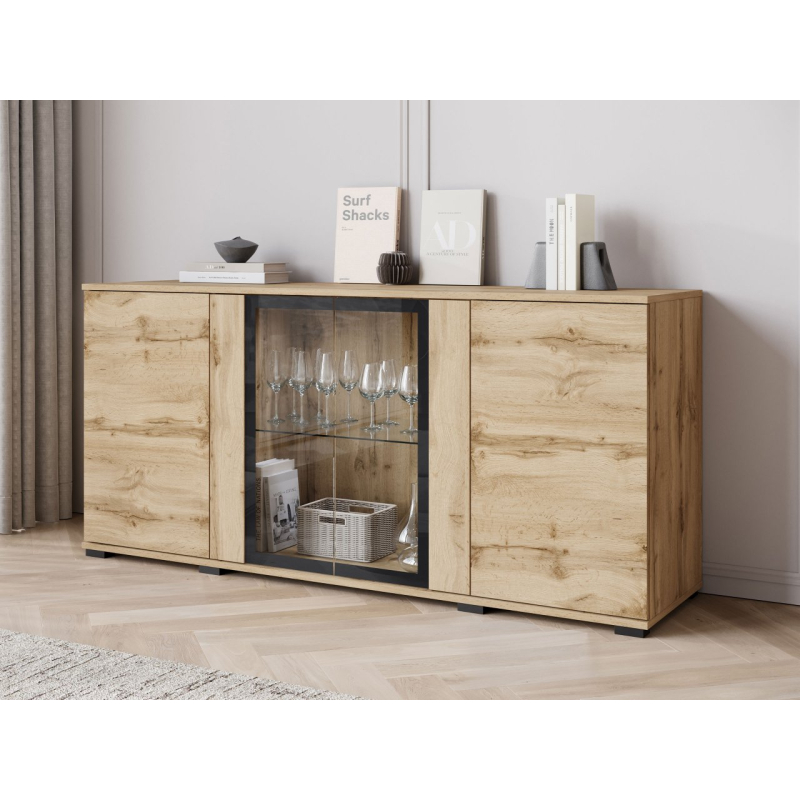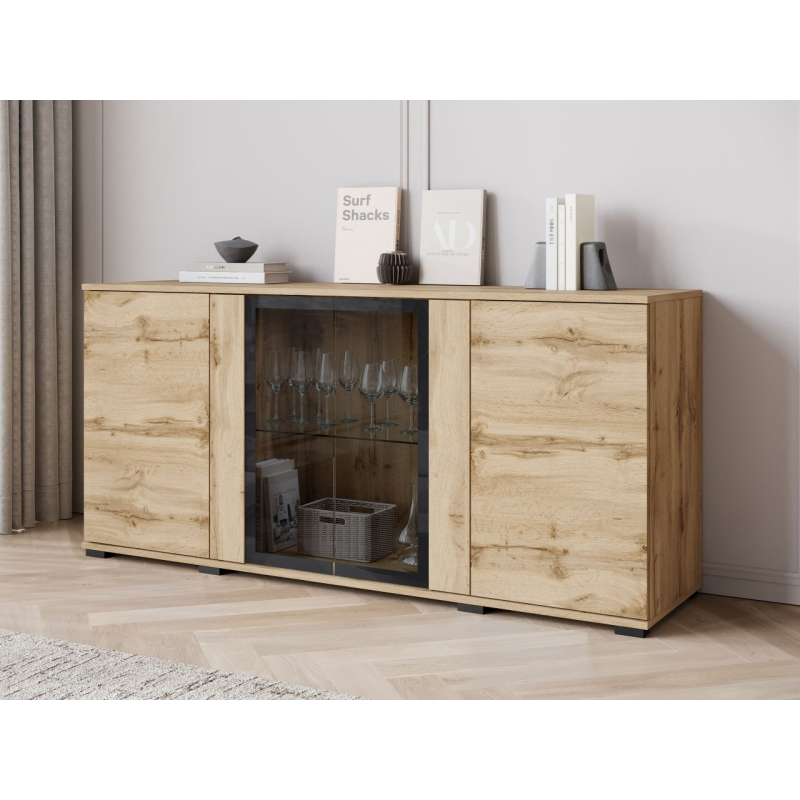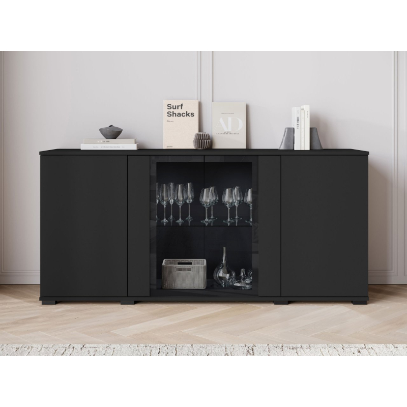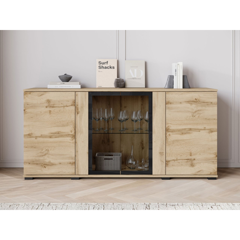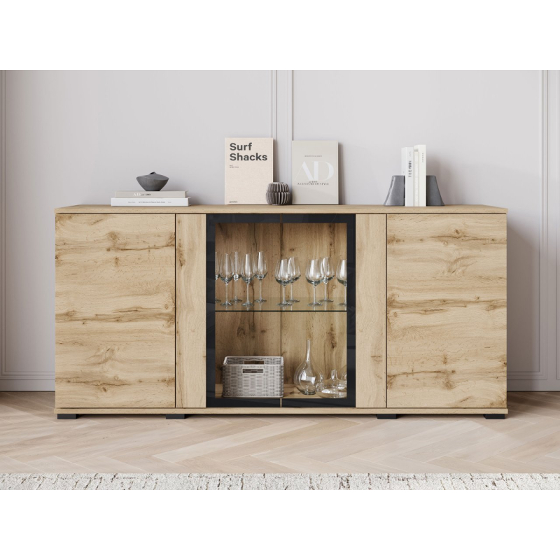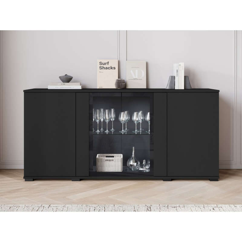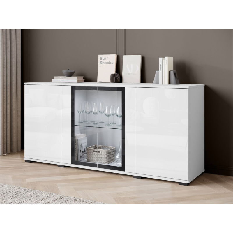 Elegantní a uspořádaný interiér vám poskytne komoda Hedvis SB 154 4D. Minimalistický tvar poskytuje jedinečný vzhled a zároveň spoustu prostoru pro organizaci. Za dvířky se nacházejí prostorné police, do kterých si můžete uložit nádobí, dokumenty nebo jiné předměty. Široká komoda má také skleněné dvířka, za kterými skvěle vypadají šálky, sklenice na víno nebo tematické dekorace.