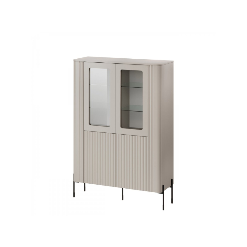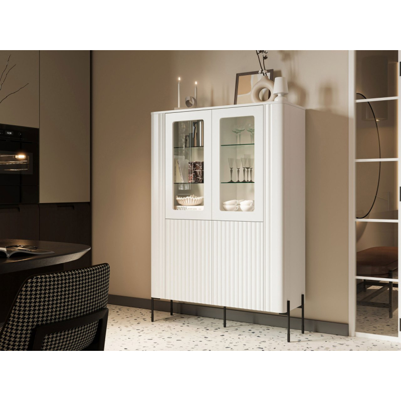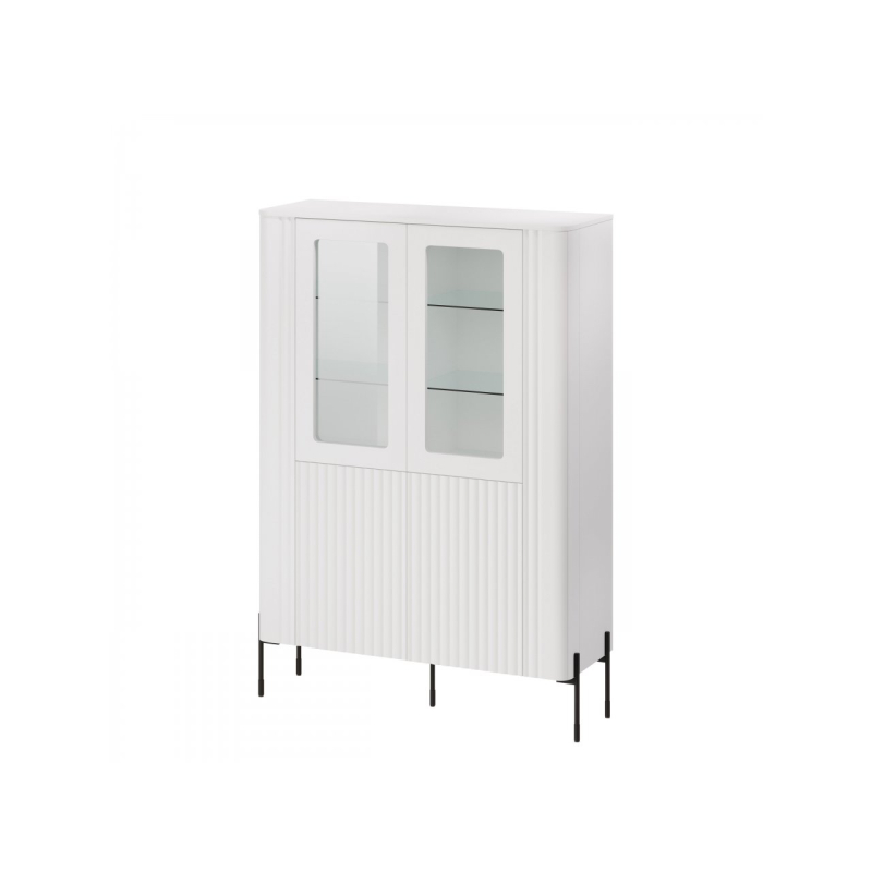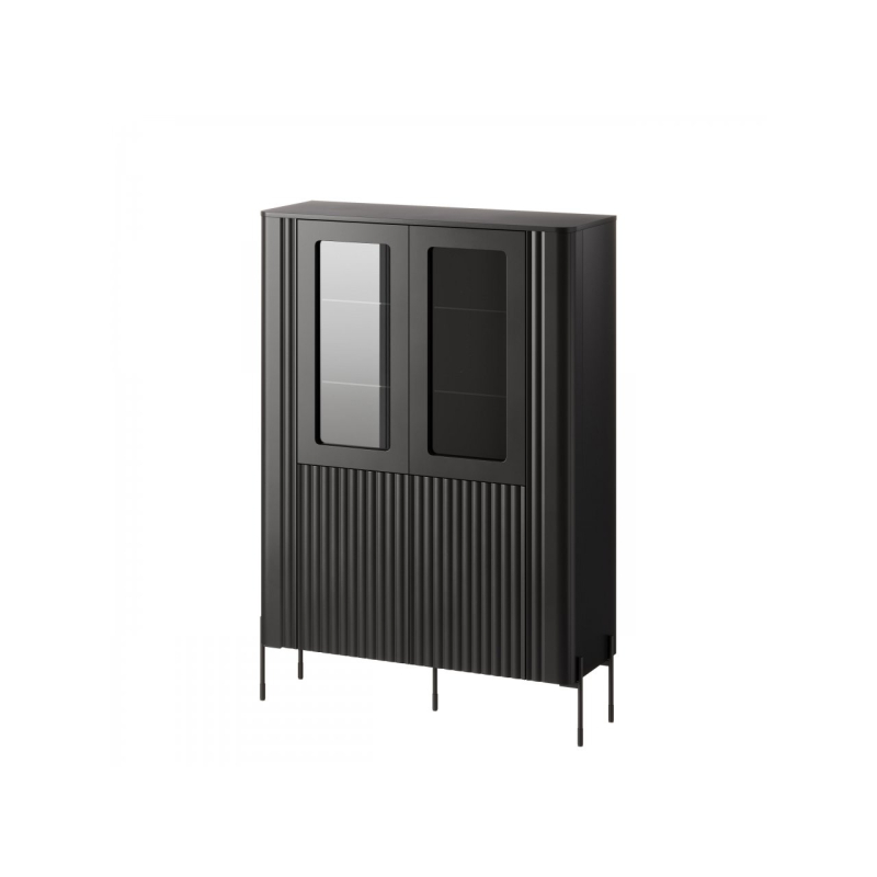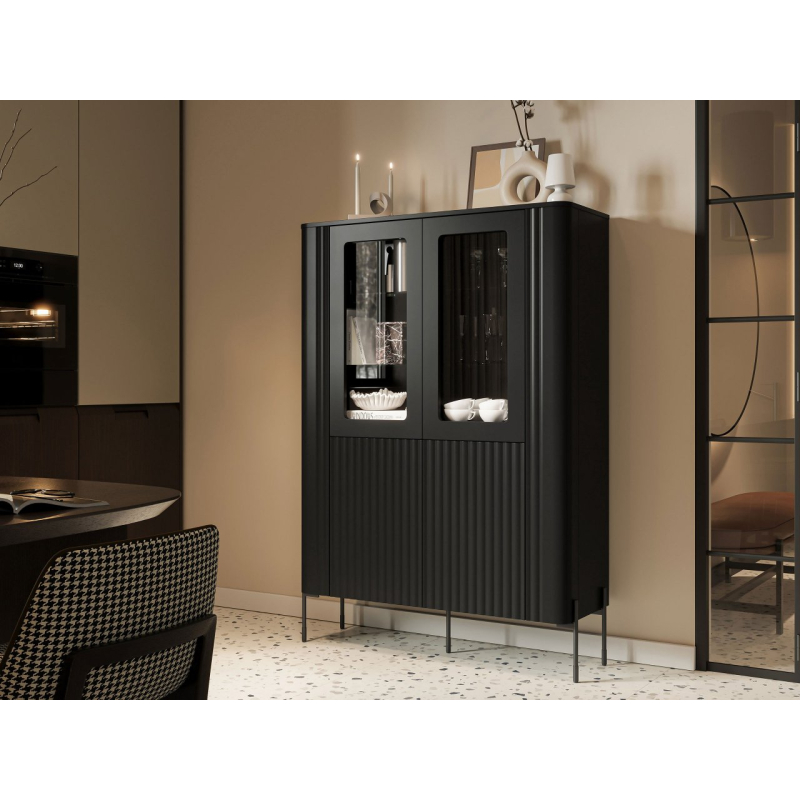 Absence úchytů a systém „PUSH TO OPEN“ zajišťují pohodlné používání a minimalistický vzhled vitríny. Celek doplňují černé kovové nohy, které mu dodávají lehký a loftový vzhled. Tato varianta se perfektně hodí k dalšímu nábytku, např. s RTV skříňkou nebo komodou, čímž se vytvoří ucelené a elegantní uspořádání obývacího pokoje.