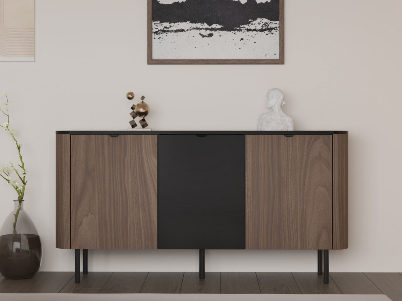 Zaoblené hrany a zajímavá barevná kombinace dělají ze skříňky Olamapo 03 o šířce 150 cm nezbytnost do vašeho interiéru. Tento model se bude hodit do moderních i klasických interiérů a dodá mu nádech loftového stylu.