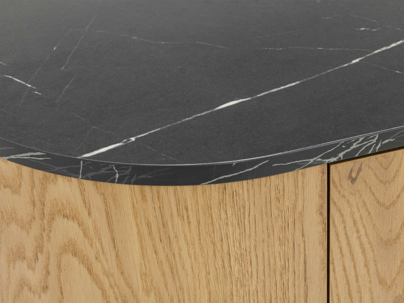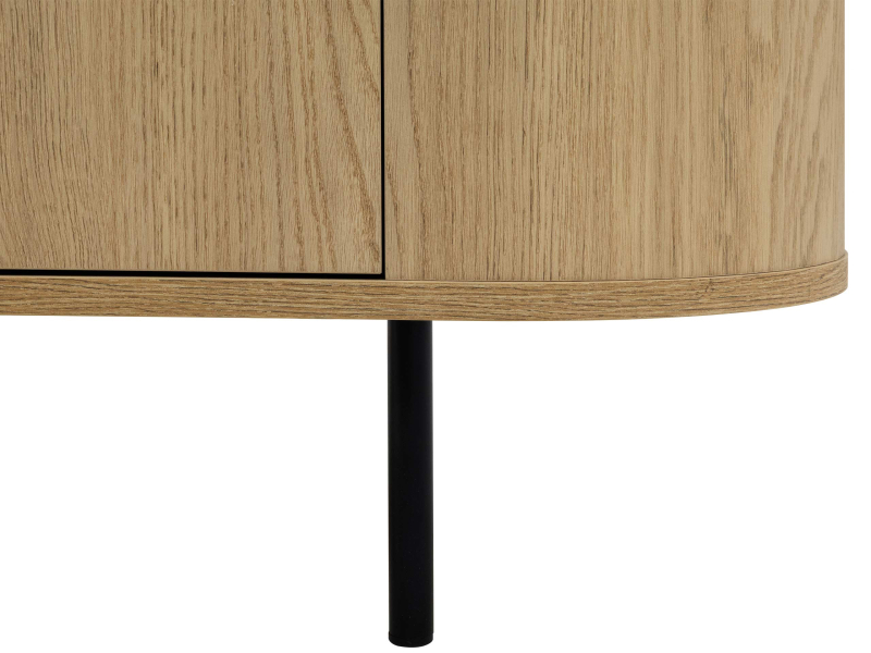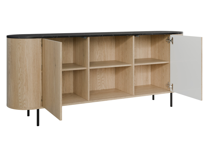Hledáte módní a elegantní nábytek? Široká skŕíňka Nisken 180 2D krásně ozdobí váš interiér a pomůže vám jej zorganizovat. Její stylový design zaujme milovníky moderních trendů. Komoda je podepřena decentním černýma nohama, které jí dodávají eleganci a jedinečný styl. Tato skříňka do obývacího pokoje se pyšní jedinečným designem. Boky jsou zaoblené, což je trend, který v současnosti dominuje trendům v interiérovém designu. Celá komoda je ve stylu Japandi. Vrchní část s decentním mramorovým vzorem dodává skříňce osobitý nádech a charakter.