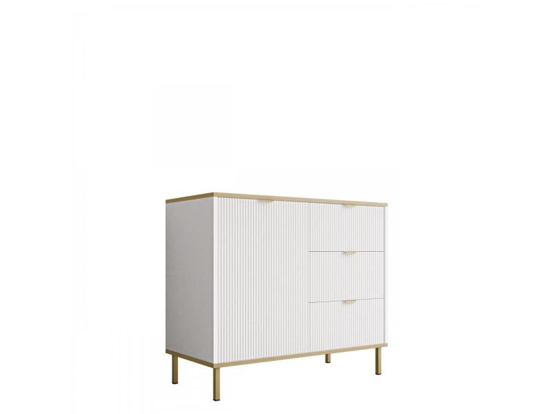Výhodou této komody na nožičkách je její praktický design. Nabízí prostorné vnitřní možnosti a šuplíky, které umožňují pohodlné uložení oblečení, doplňků a jiných bytových potřeb. Jemné drážky na předních stranách dodávají nábytku jedinečný charakter, zatímco zlaté povrchové úpravy na nohou a úchytkách přinášejí eleganci a lehkost.