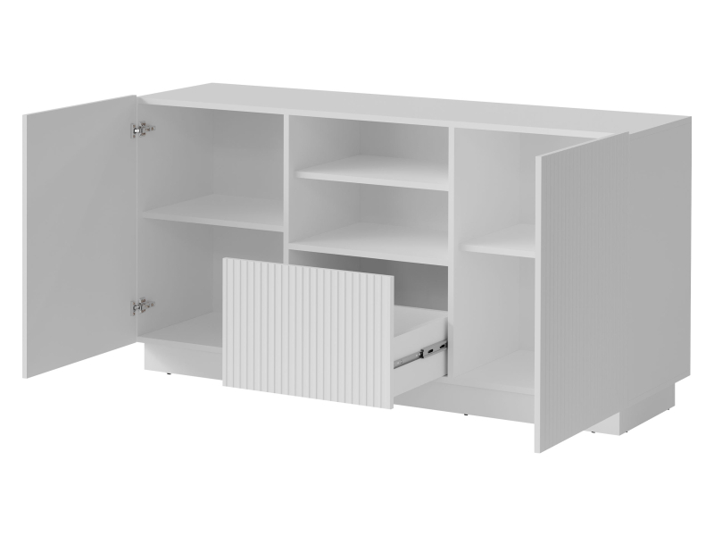 Dodejte svému domovu moderní nádech s komodou Ceroza 150 cm s drážkovanými předními stranami. Minimalistický design podtrhuje eleganci interiéru a zároveň je doplněn prvky, které rozšiřují úložné možnosti.