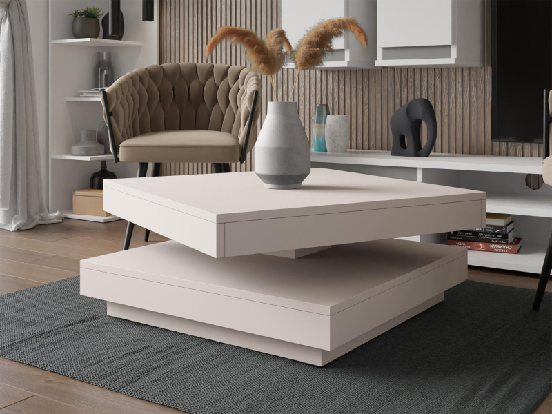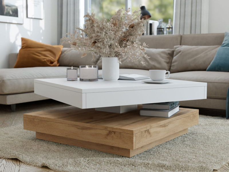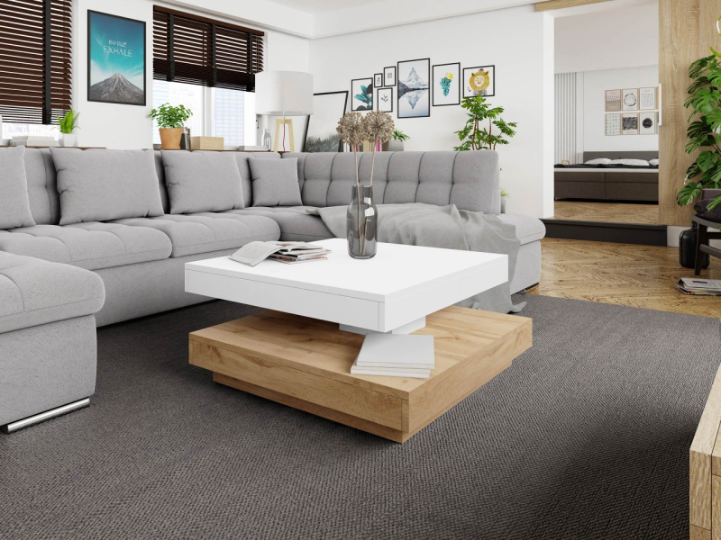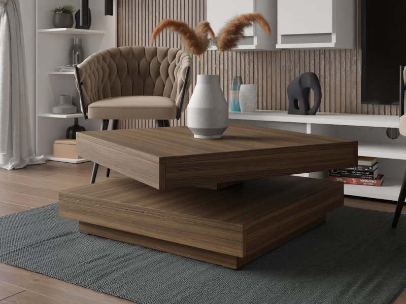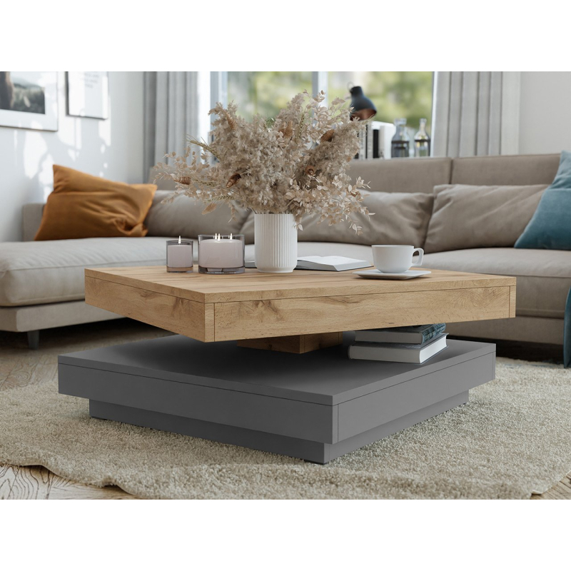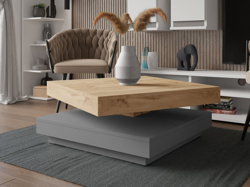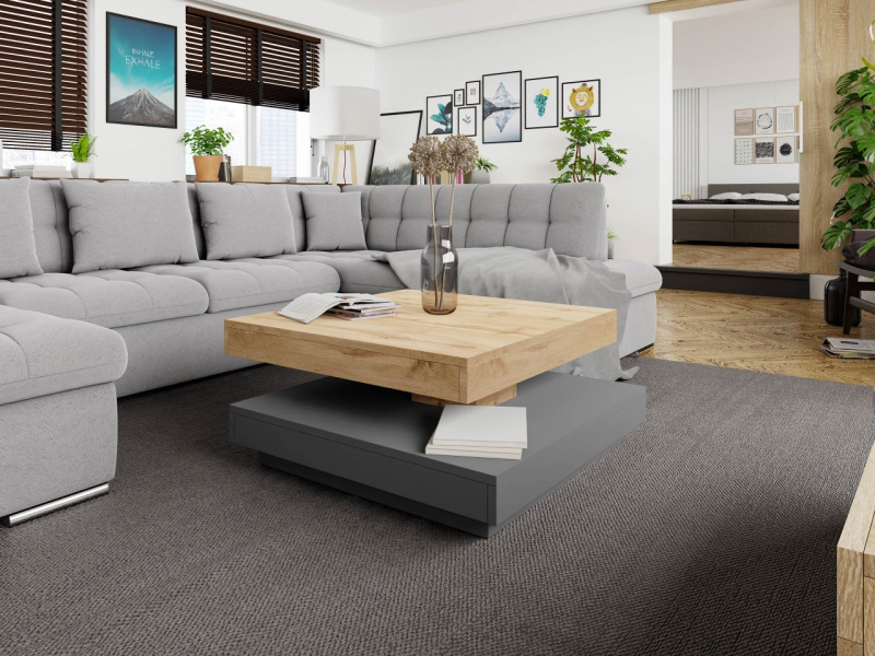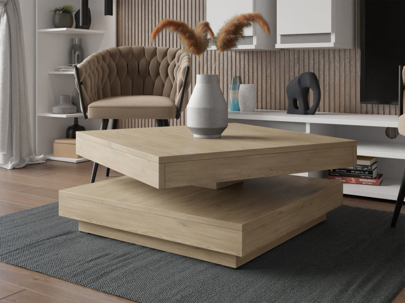 Konferenční stolek Druzjan byl vybaven dvěma užitečnými deskami. Spodní deska je stabilní základnou nábytku, zatímco uspořádání vrchního dílu je možné přizpůsobit vašim aktuálním potřebám. Mezi deskami byl použit speciální mechanismus, který umožňuje otočení horní desky stolu o 360 stupňů. Pohyblivá deska nabízí mnoho vybavení pro uživatele a zajímavý dekorativní akcent do obývacího pokoje.