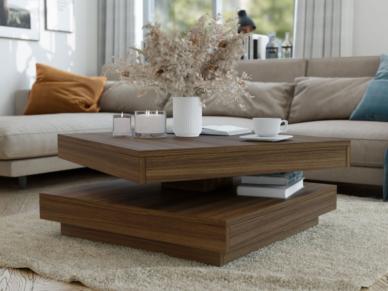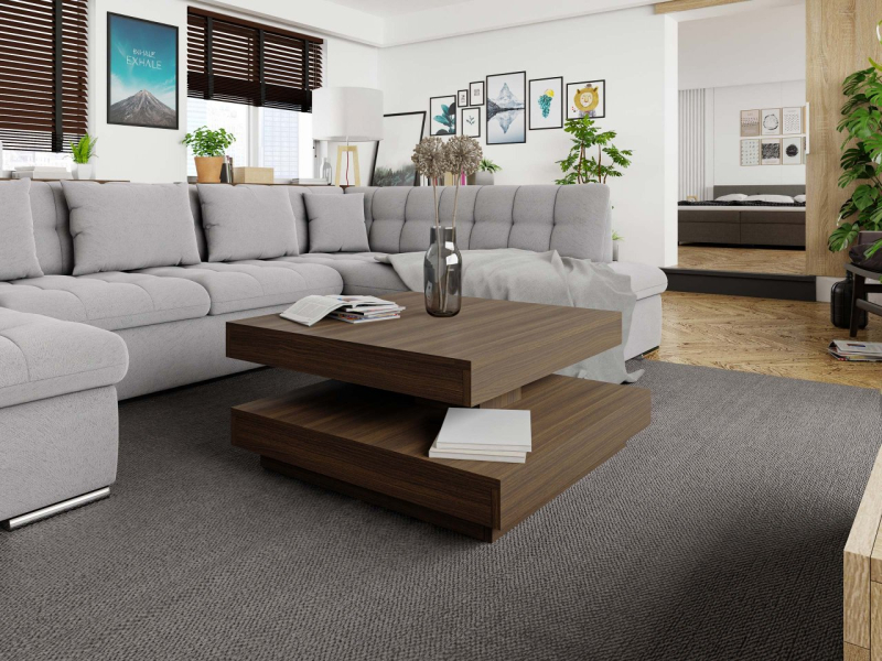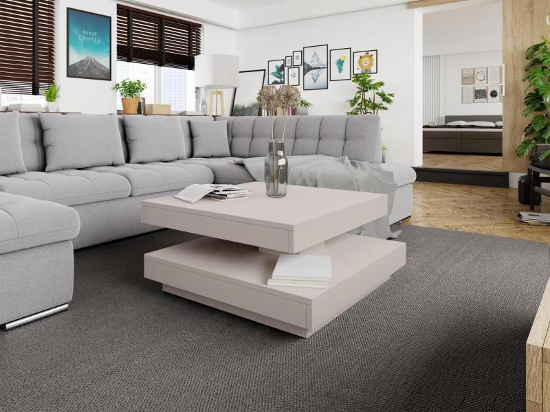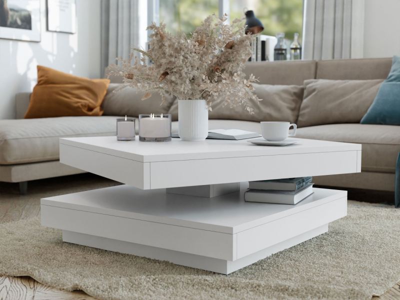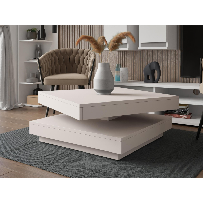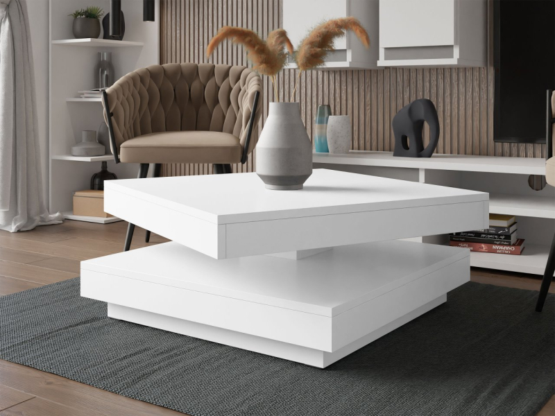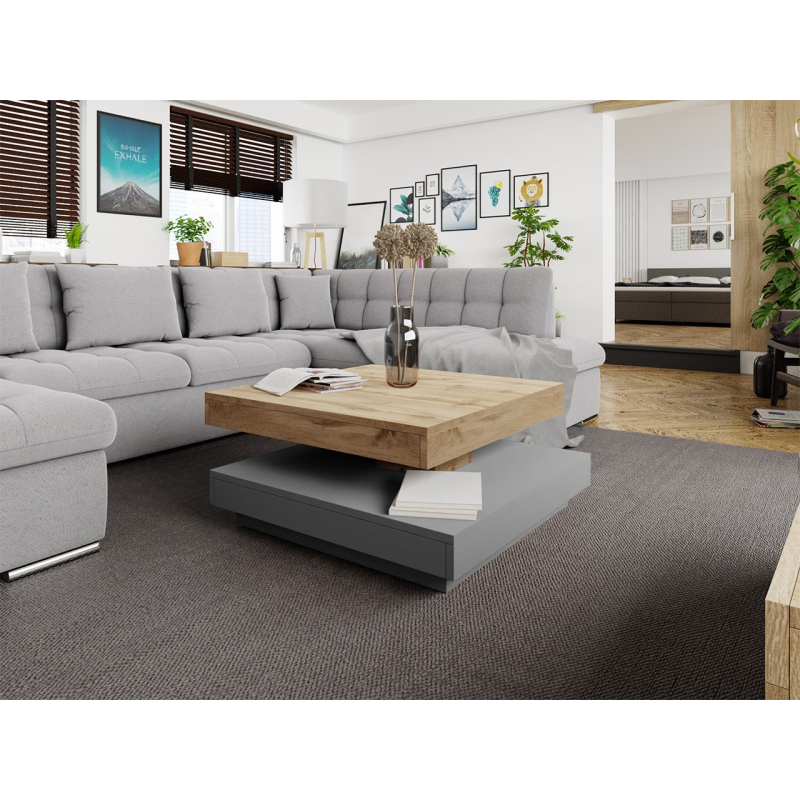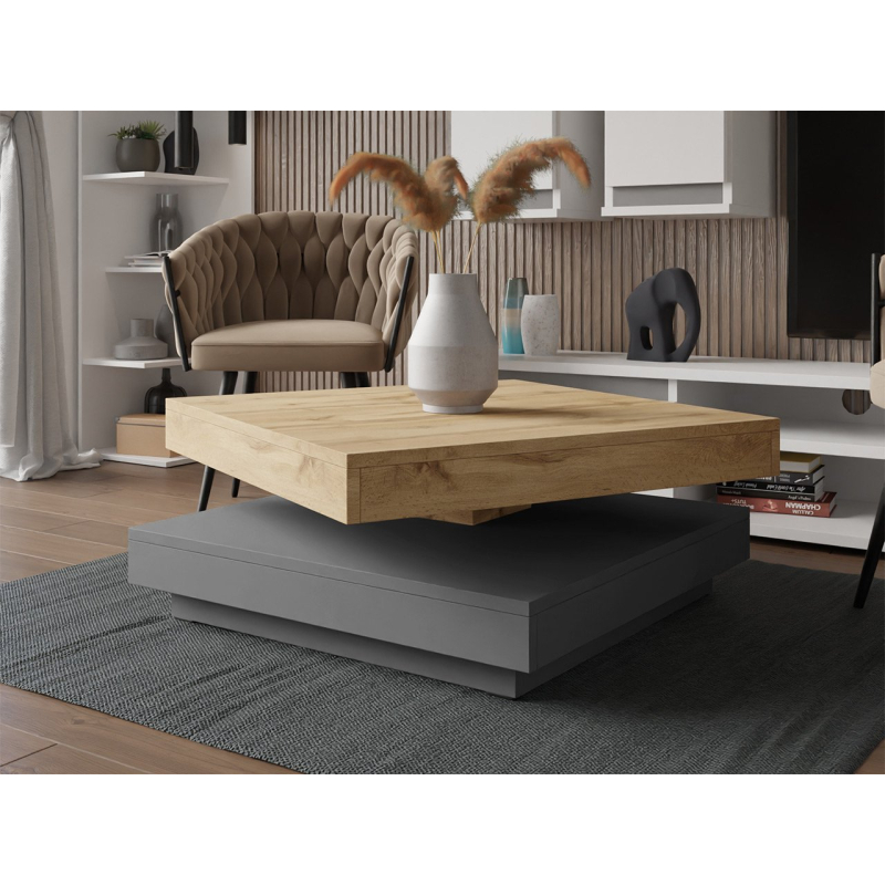 Konferenční stolek Druzjan byl vybaven dvěma užitečnými deskami. Spodní deska je stabilní základnou nábytku, zatímco uspořádání vrchního dílu je možné přizpůsobit vašim aktuálním potřebám. Mezi deskami byl použit speciální mechanismus, který umožňuje otočení horní desky stolu o 360 stupňů. Pohyblivá deska nabízí mnoho vybavení pro uživatele a zajímavý dekorativní akcent do obývacího pokoje.