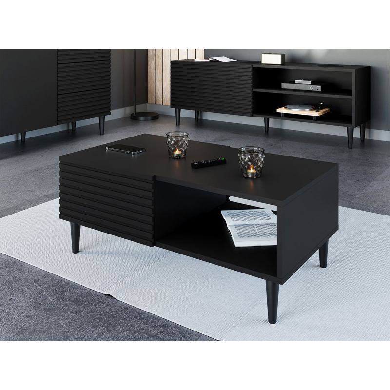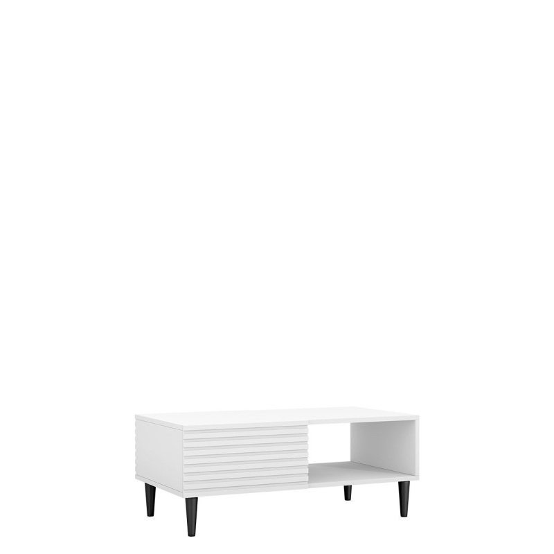 Model je usazen na zúžených dřevěných nožkách, které výrazně usnadní úklid podlahy. Disponuje také úložným prostorem v podobě otevřené a uzavřené police. Stolek nemá žádné úchyty a lze jej otevřít díky systému "push to open".