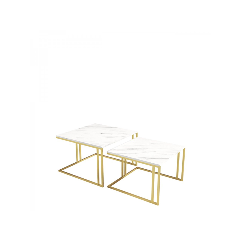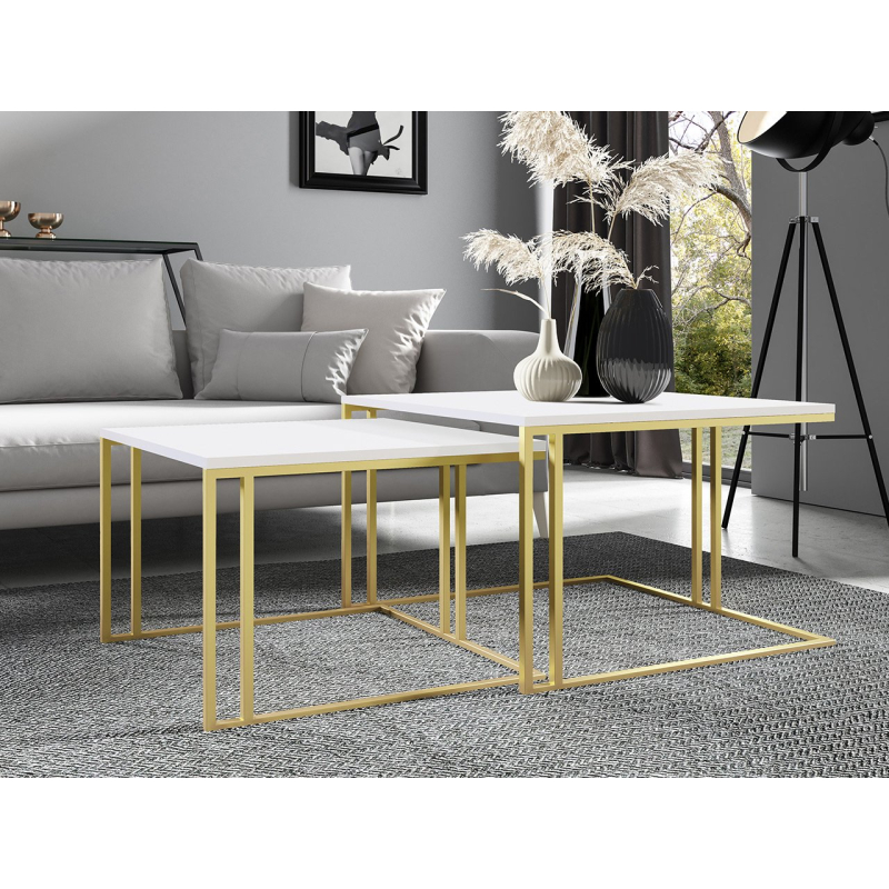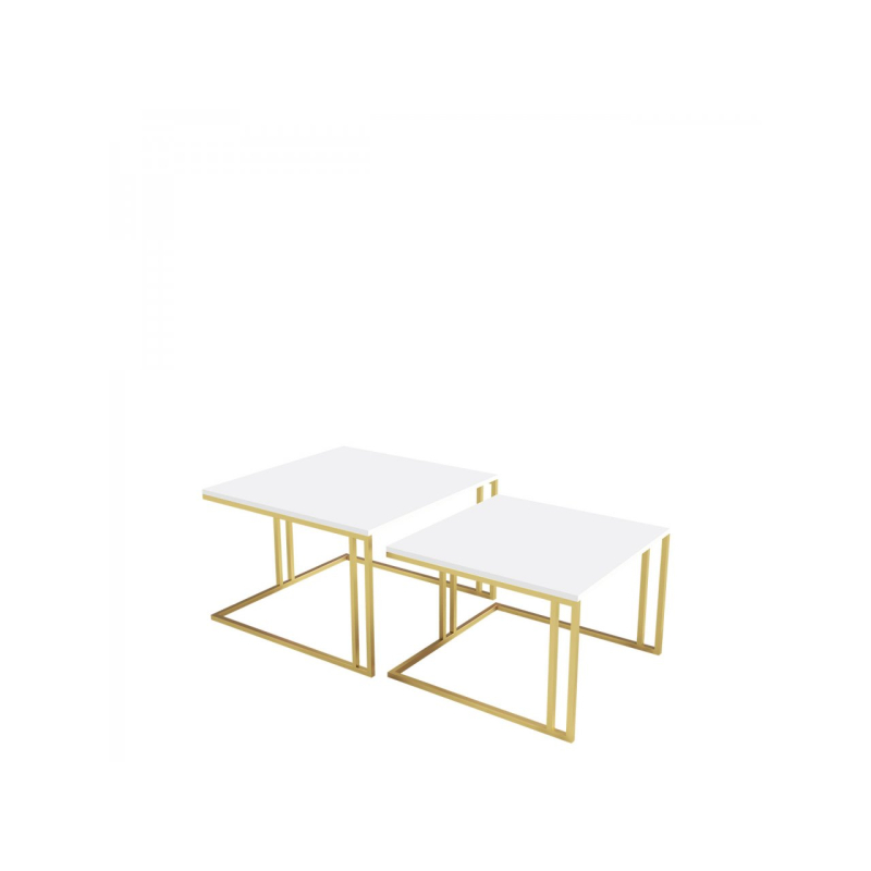 Set konferenčního stolku Froyw Gold je elegantním a praktickým doplňkem do obývacího pokoje nebo jiné místnosti vašeho domova. Tato sada se skládá ze dvou stolů různých velikostí, které se dokonale doplňují a vytvářejí harmonické uspořádání.