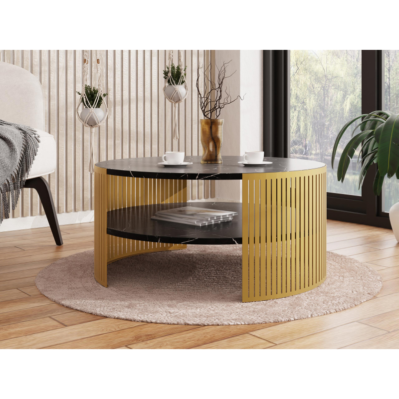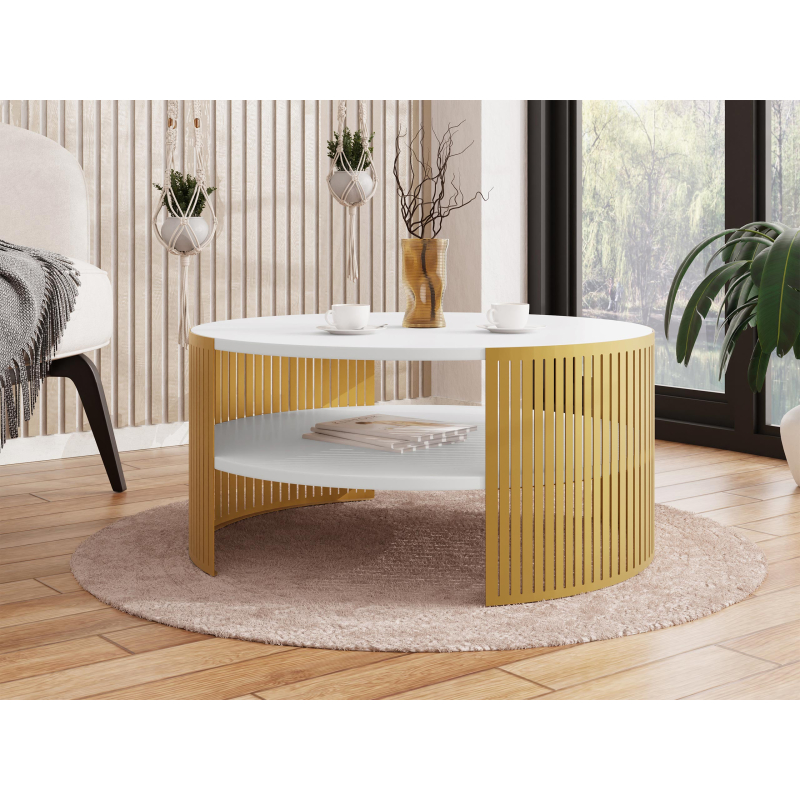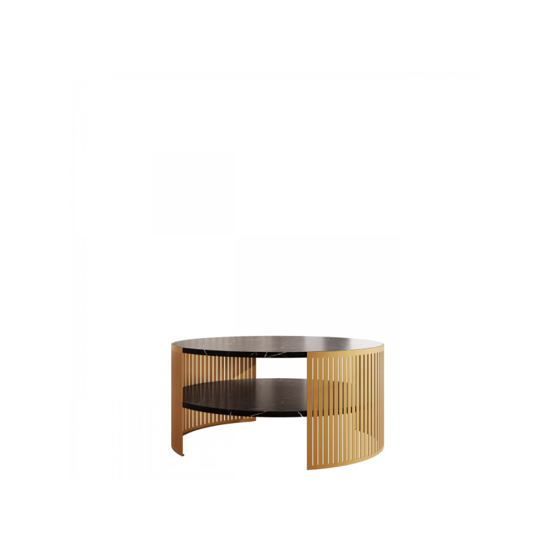 Vneste do svého prostoru rafinované kouzlo výběrem kulatého konferenčního stolku Zinzit Gold. Jedinečný základ, kterým je kovový rám, dodává nábytku stabilitu a zároveň zdůrazňuje jeho elegantní design.