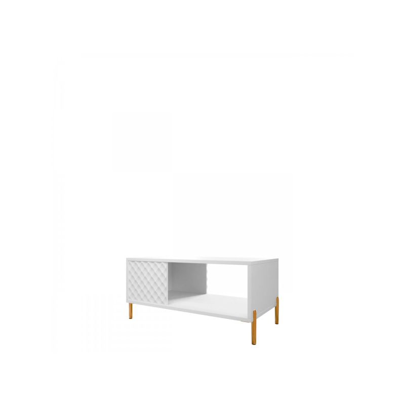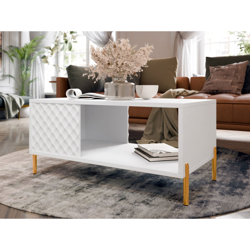 Moderní konferenční stolek Fetroso je perfektním řešením pro moderní a okouzlující interiéry. Díky jedinečným dekoracím bude váš obývací pokoj vypadat noblesně, elegantně a prestižně. Efektní je matný povrch v kombinaci se zlatými kovovými nohami.