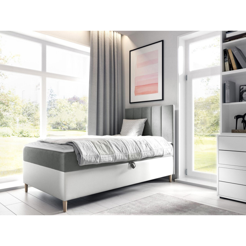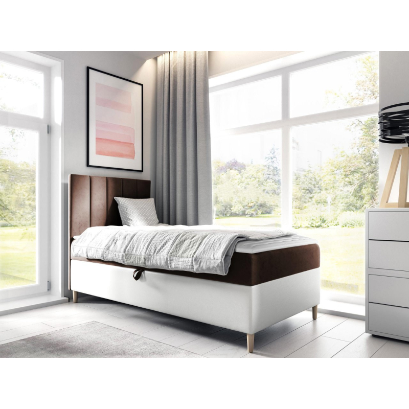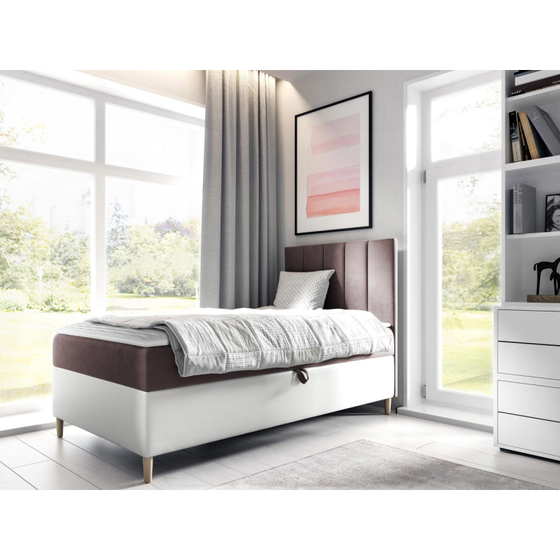 Prezentovaná postel pro mládež není jen elegantní. Nabízí mnohem víc. Poskytuje pohodlí díky matrací. Hlavní je základna postele a horní je její funkčním doplňkem. Topper má hypoalergenní materiály nejvyšší kvality a snadno se připevňuje pomocí 4 odolných gumiček. Jednoduchý přístup čistícího robota zajišťují 13 cm vysoké dřevěné nohy.