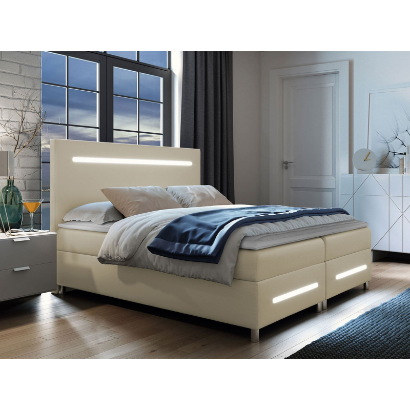 Moderní kontinentální postel Trunida se hodí do designu moderní ložnice. Jednoduchý korpus, syté barvy potahových látek a jemné nožičky jsou prvky, které zdůrazňují jeho stylový vzhled. Výhodou je také osvětlení LED. Pruhy v opěrce hlavy a podnožce zvýrazňují design celé ložnice.