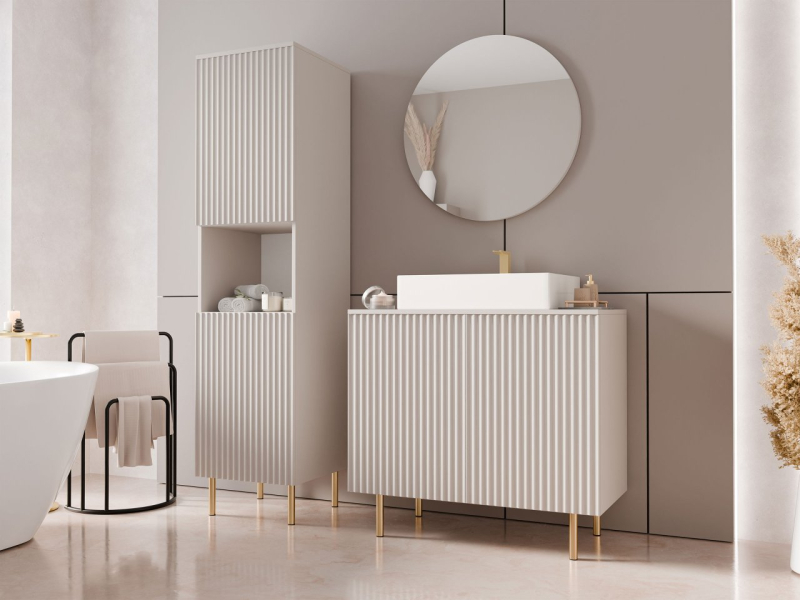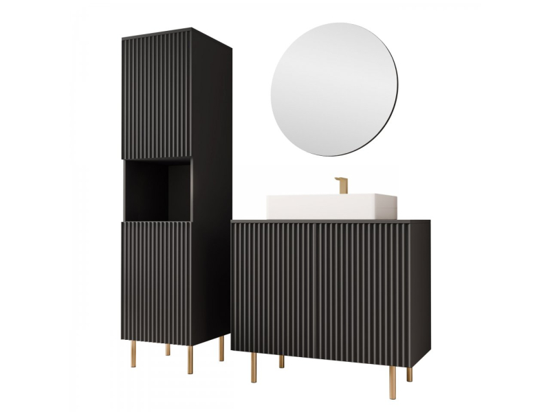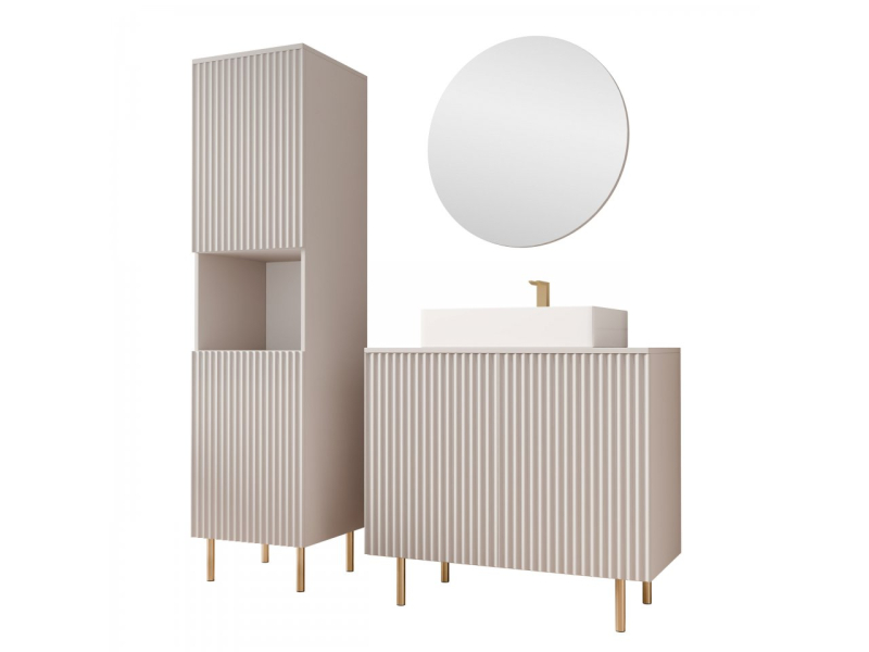 Vytvořte si elegantní a okouzlující koupelnový prostor s koupelnovým nábytkem Nawil III. Tato sada kombinuje frézované čela se zlatými kovovými nohami. Sada obsahuje zrcadlo, skříňku pod umyvadlo, umyvadlo na podstavci a umyvadlo na desku (k dispozici za příplatek).