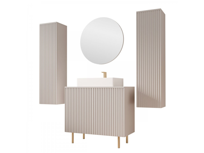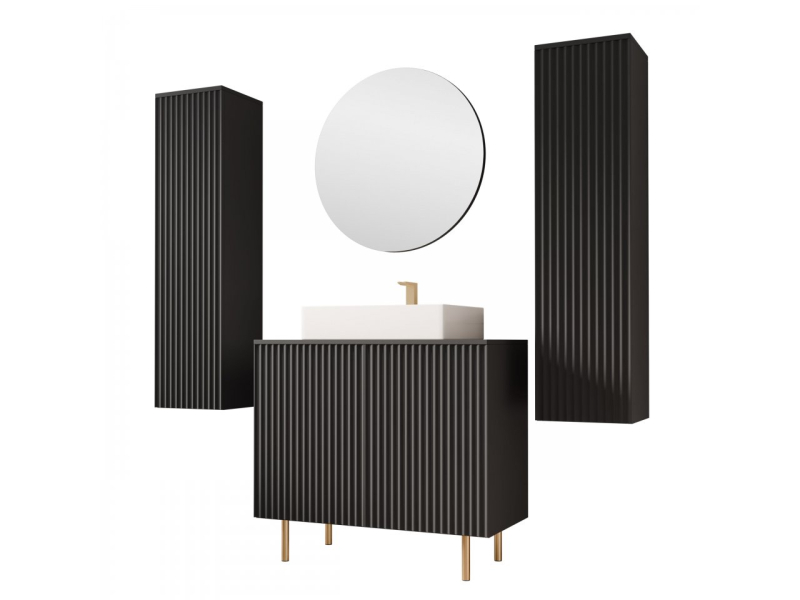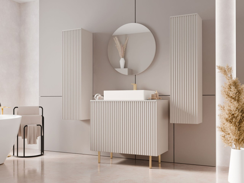Koupelnový nábytek Nawil IV je ztělesněním moderní elegance. Díky rozmanitým barvám se perfektně hodí do každého prostoru. Nábytek se vyznačuje vertikálním frézováním a zlatými nohami, které mu dodávají mimořádně stylový, ale zároveň decentní a nadčasový vzhled. Moderní nádech dodává i systém otevírání bez úchytek. Skříňky se otevírají bez úchytek; stačí jemně zatlačit na přední stranu a mechanismus se aktivuje.