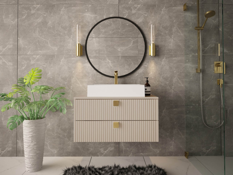 Výrazný vzhled koupelnové skříňky je založen na kombinaci módních barev a designových dekorů. Na první pohled zaujmou vyfrézované drážky. Na čelech zásuvek jsou také zajímavé úchytky ve zlaté barvě.