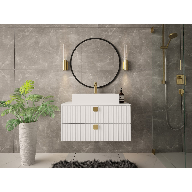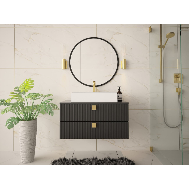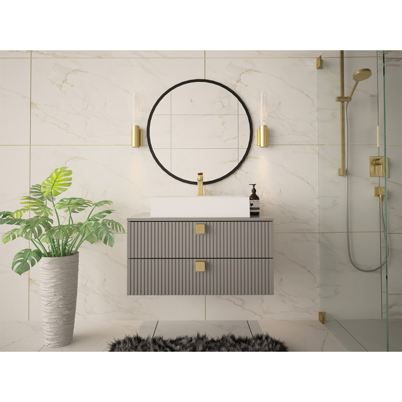 Výrazný vzhled koupelnové skříňky je založen na kombinaci módních barev a designových dekorů. Na první pohled zaujmou vyfrézované drážky. Na čelech zásuvek jsou také zajímavé úchytky ve zlaté barvě.