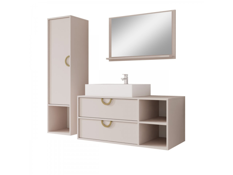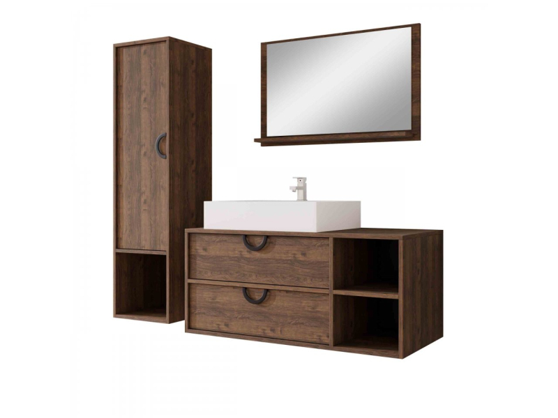Koupelnový nábytek Gewiro je ideální volbou pro ty, kdo hledají spojení moderního designu a praktičnosti. Tento set sestává ze závěsné skříňky, skříňky pod umyvadlo a elegantního zrcadla s praktickou poličkou. Umyvadlo, stejně jako baterii na umyvadlo, lze doobjednat dle potřeby, takže si můžete vyskládat sestavu přesně podle svých představ.