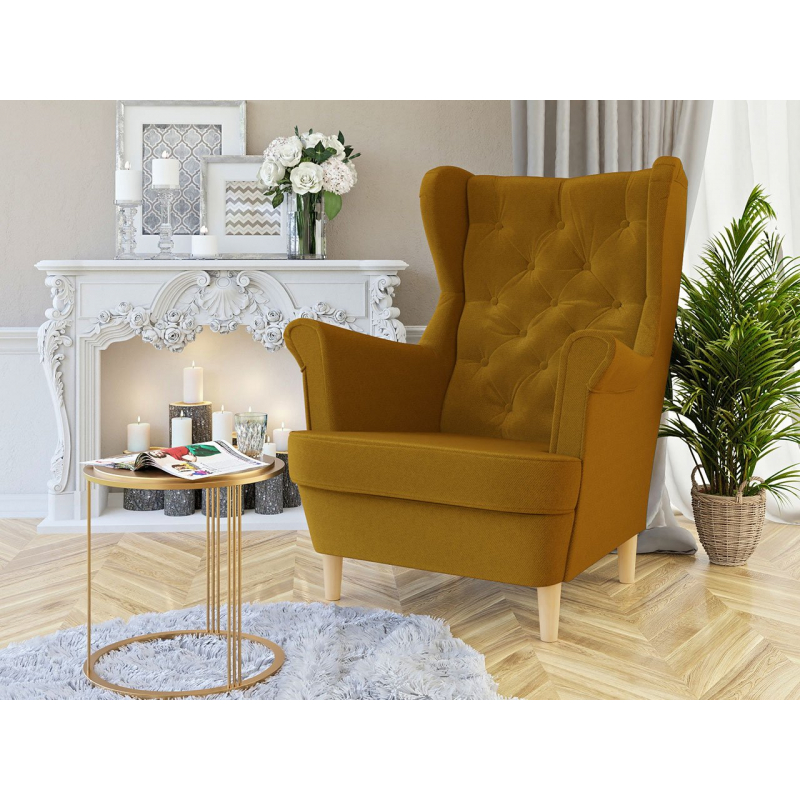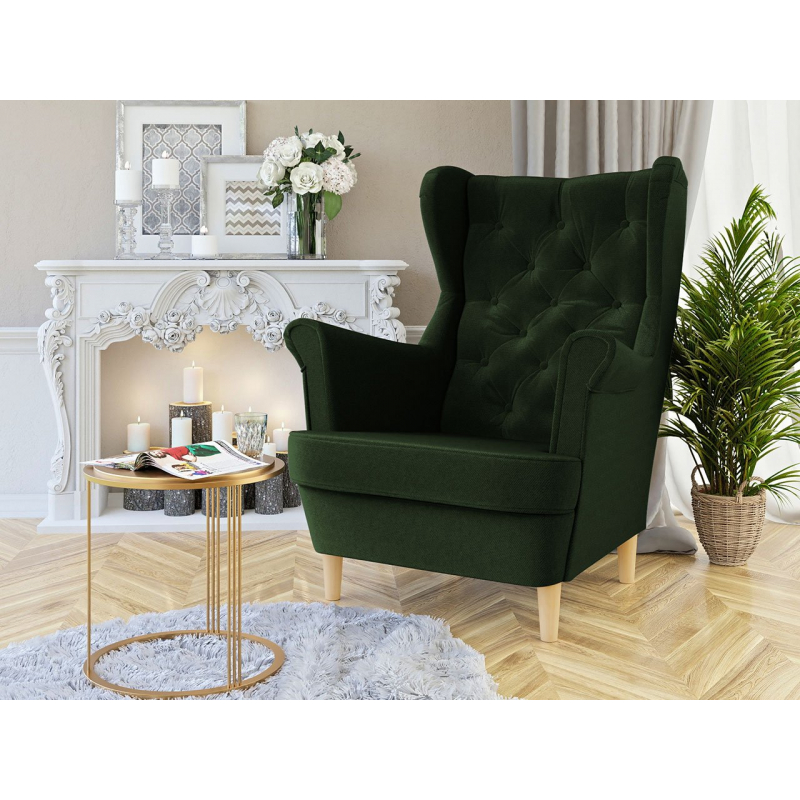 - křeslo je volně stojící v místnosti (opěradlo potažené látkou)