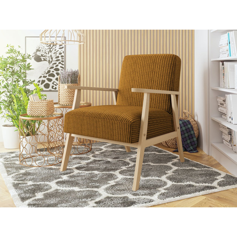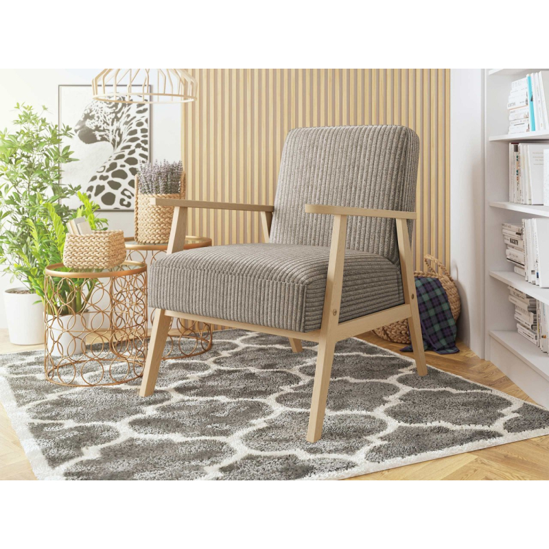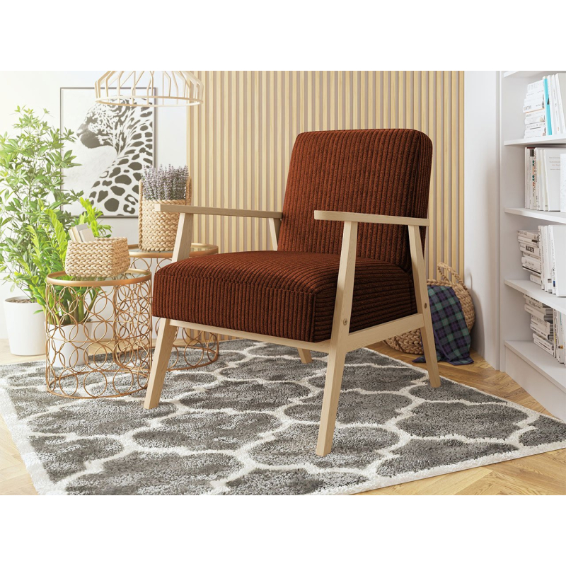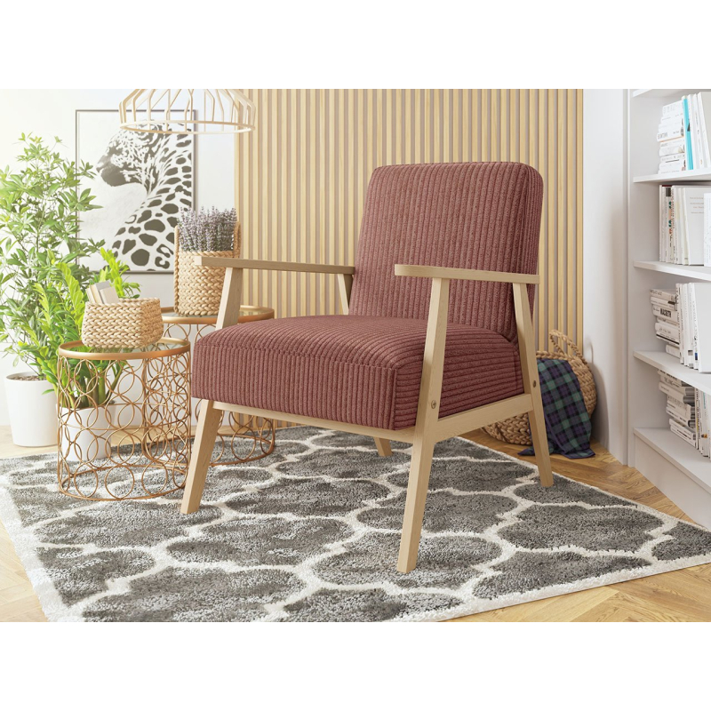 Křeslo Pawiva svým tvarem a čalouněním připomíná modely z 60. let. Retro styl je dán především tvarem - nízko posazeným sedákem na vysokém dřevěném rámu. Látka čalounění připomíná kdysi módní manšestr, ale je velmi příjemná na dotek a odolná. Spolu s pěnou je židle mimořádně pohodlná.