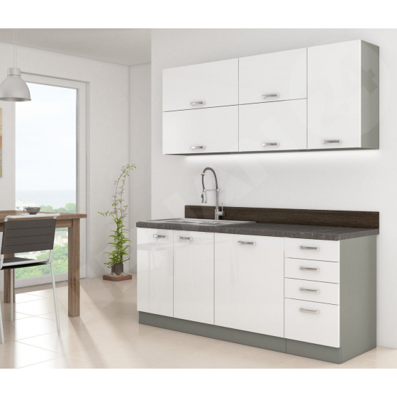 Kuchyňský nábytek Multiline III zahrnuje: závěsné skříňky, umyvadlo, skříň s policemi a zásuvkami.