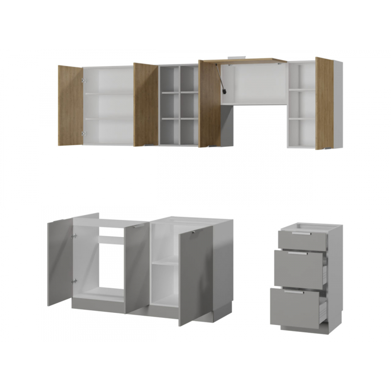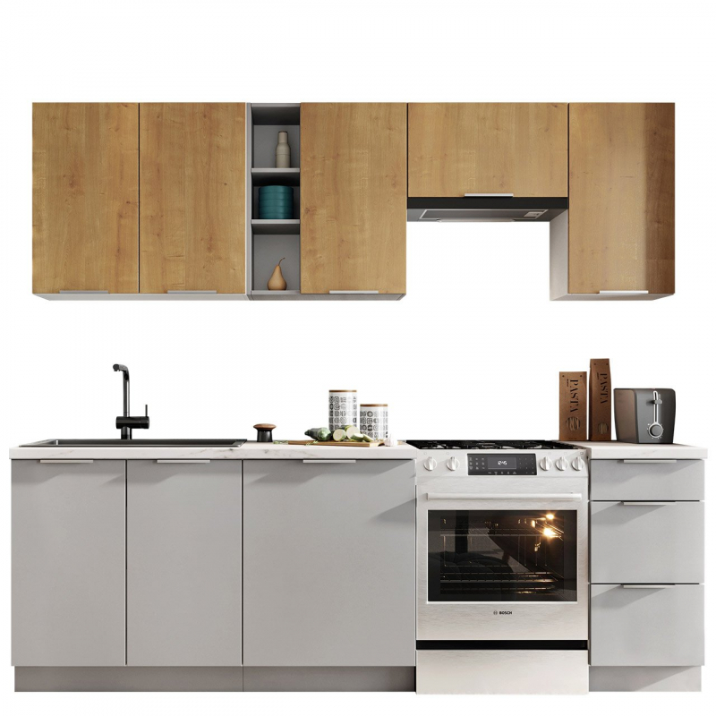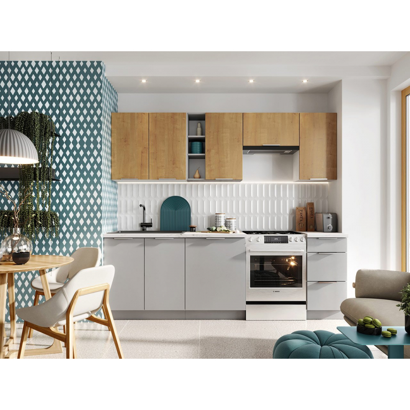 Stylově zařízená kuchyň vybízí k přípravě chutného jídla pro celou rodinu. S kuchyňským nábytkem Oleica 240 si zařídíte takový přátelský a moderně vypadající prostor. Nejmódnější barvy dvířek horních a spodních skříněk se dokonale hodí ke každému stylu. Kuchyňské skříňky a prostorné zásuvky poskytují dostatečný prostor pro porcelán, hrnce a náhradní potraviny. Sada obsahuje také skříňku pod umyvadlo a speciální přihrádku na digestoř.