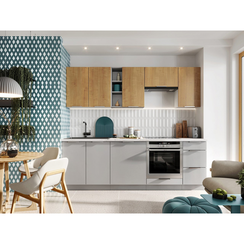Kuchyňský nábytek Oleica je kombinací moderního, minimalistického designu s barvami, které do místnosti vnesou nádech útulnosti. Navíc dobře navržená, funkční kuchyně zpříjemní vaření jídel vám nebo vašim blízkým. K tomuto účelu nabízí prezentovaný kuchyňský nábytek praktická řešení, včetně četných skříněk s prostornými policemi. V horní části je navíc umístěna úzká otevřená police, která slouží k umístění vašich oblíbených předmětů. Na druhé straně ve spodní části je skříňka pod sporák a skříňka se šuplíky.
