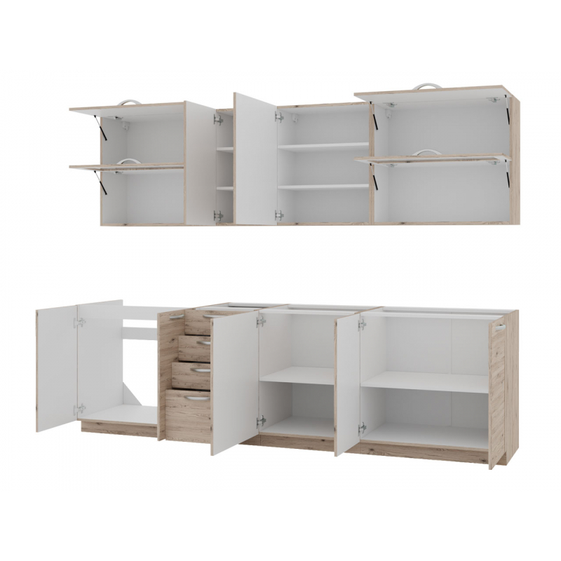 Čela a korpusy kuchyňského nábytku jsou vyrobeny z desek, jejichž styl a design napodobuje strukturu dřeva. Desky používané v kuchyních More 260 jsou odolné. Snadno se udržují v čistotě a není třeba používat speciální konzervační prostředky. Protože se jedná o místo, kde trávíme poměrně hodně času, mělo by být funkční, pohodlné a přizpůsobené potřebám a životnímu stylu členů domácnosti. Kuchyně More 260 stoprocentně splní vaše požadavky a bude vypadat dokonale.