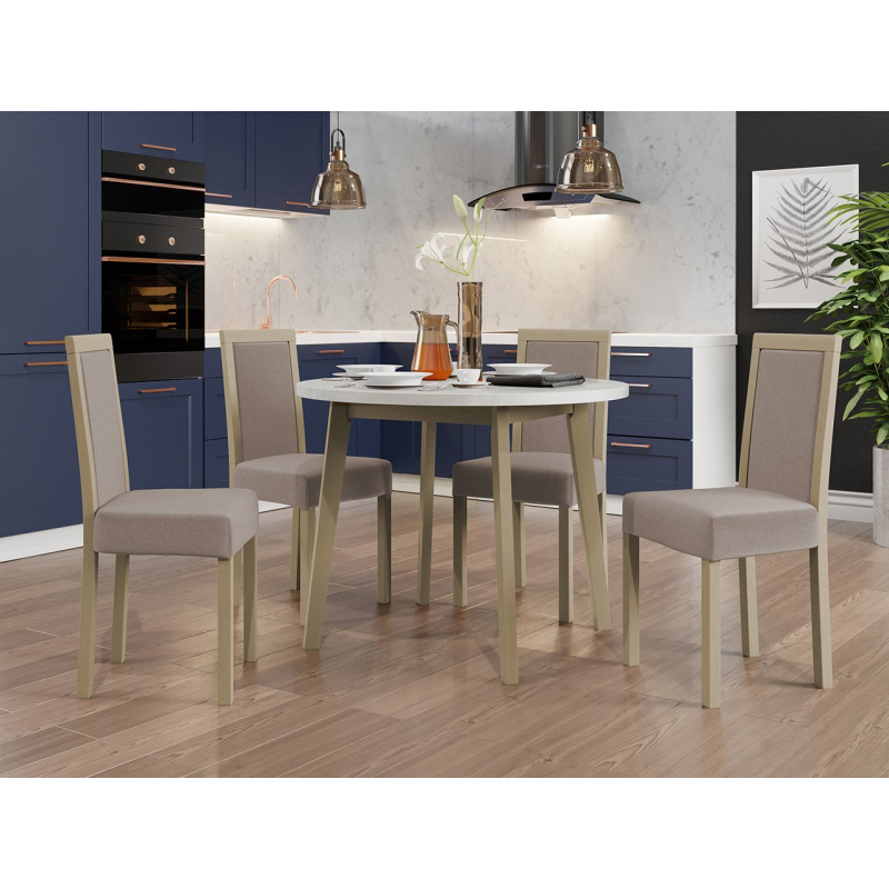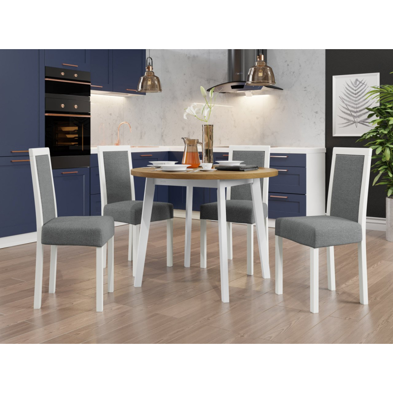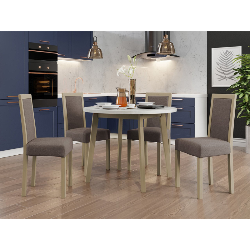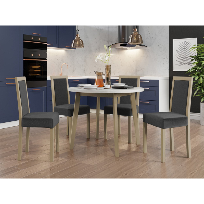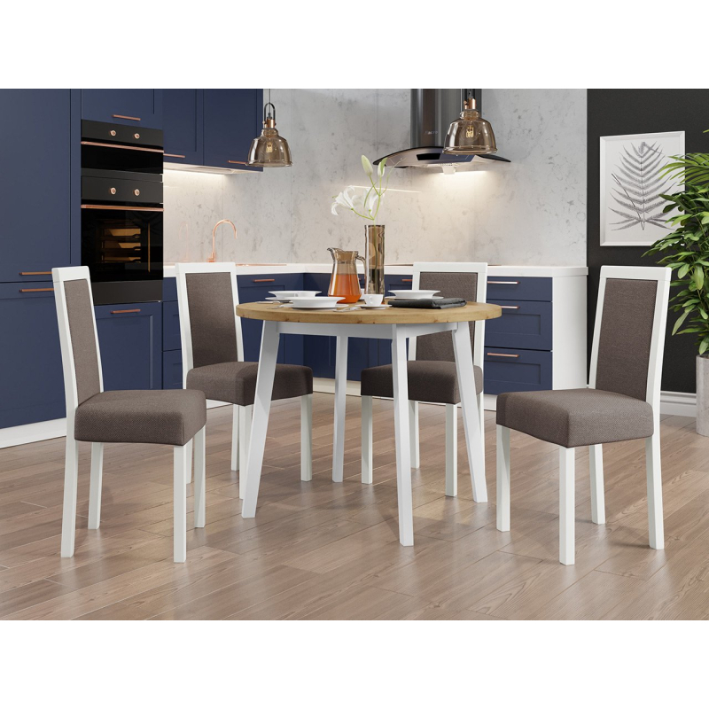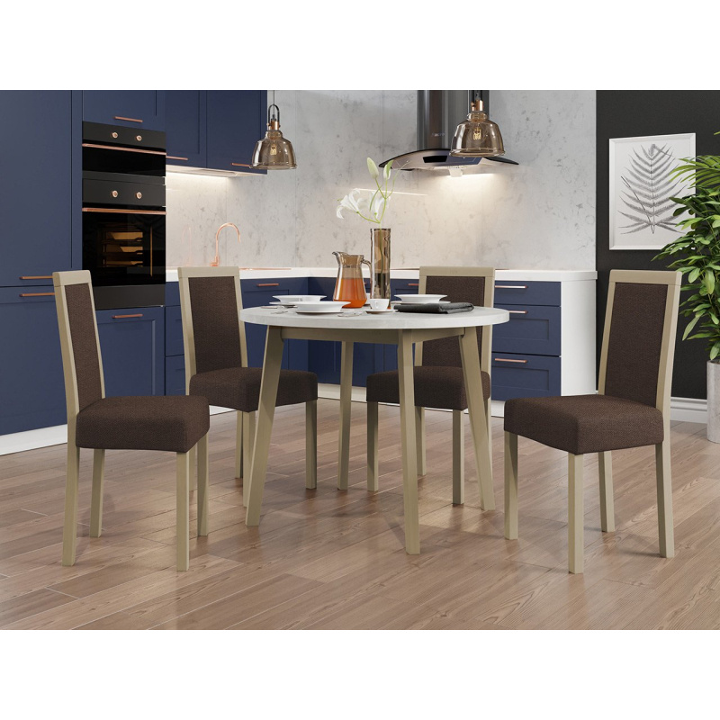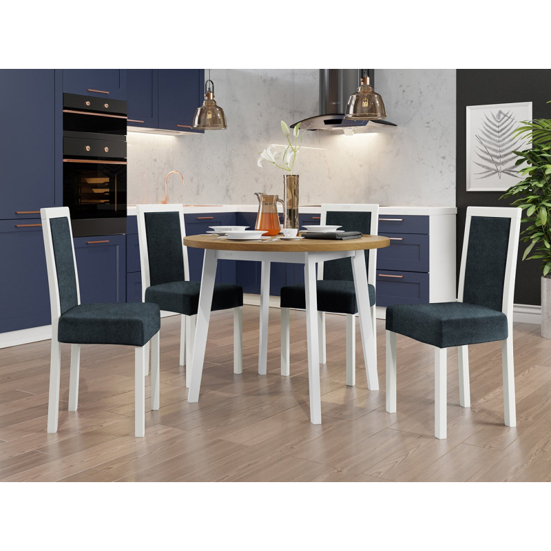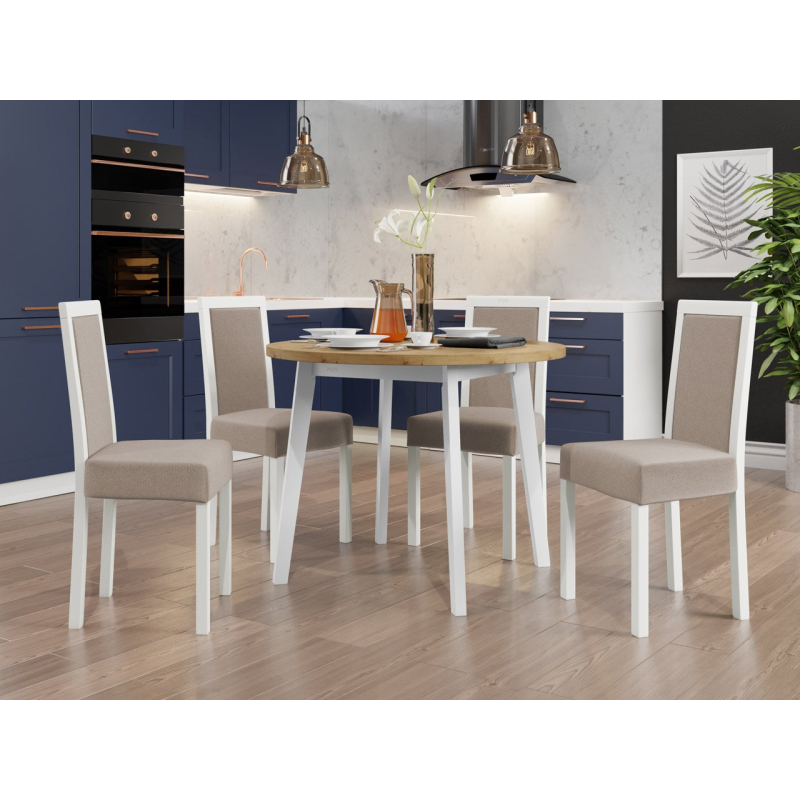 Náš krásný kulatý stůl se čtyřmi elegantními židlemi je ideální volbou pro vaši jídelnu nebo obývací pokoj. Dodá vašemu prostoru jedinečné kouzlo a vytvoří dokonalé místo pro setkání a společné stolování.
