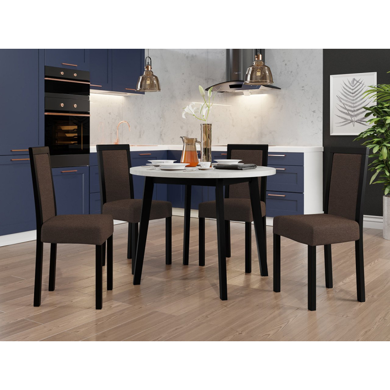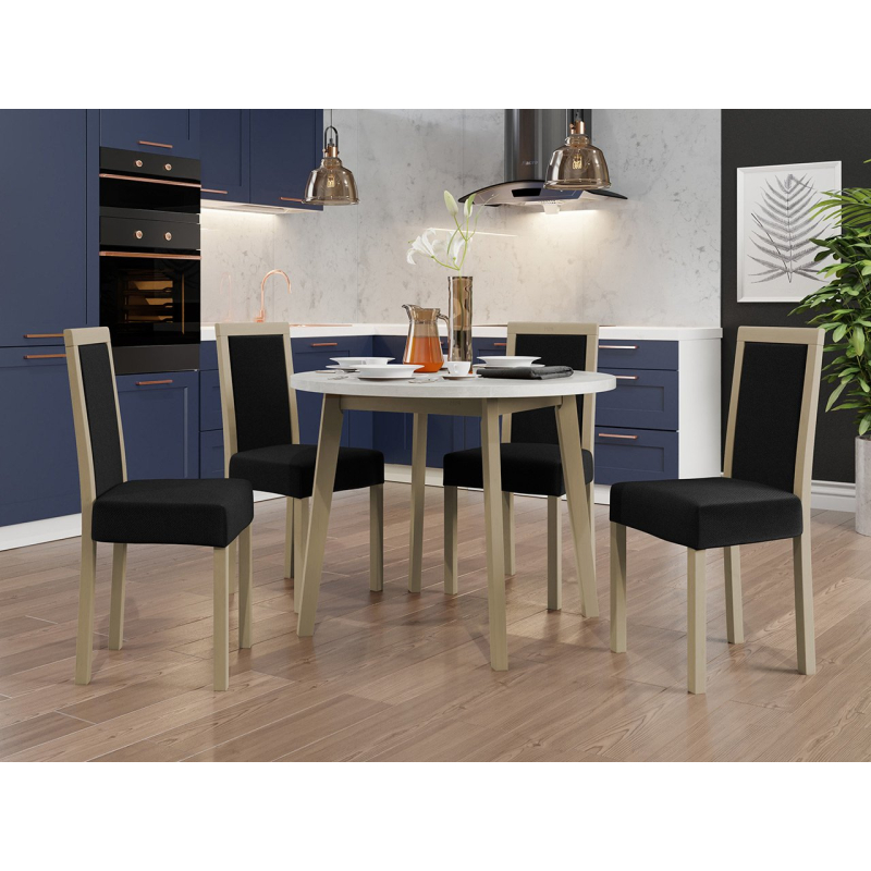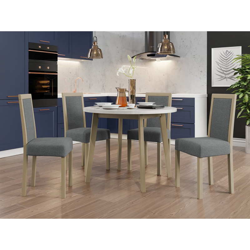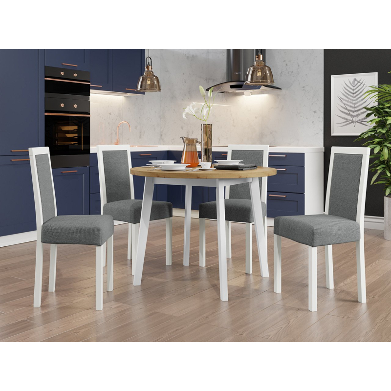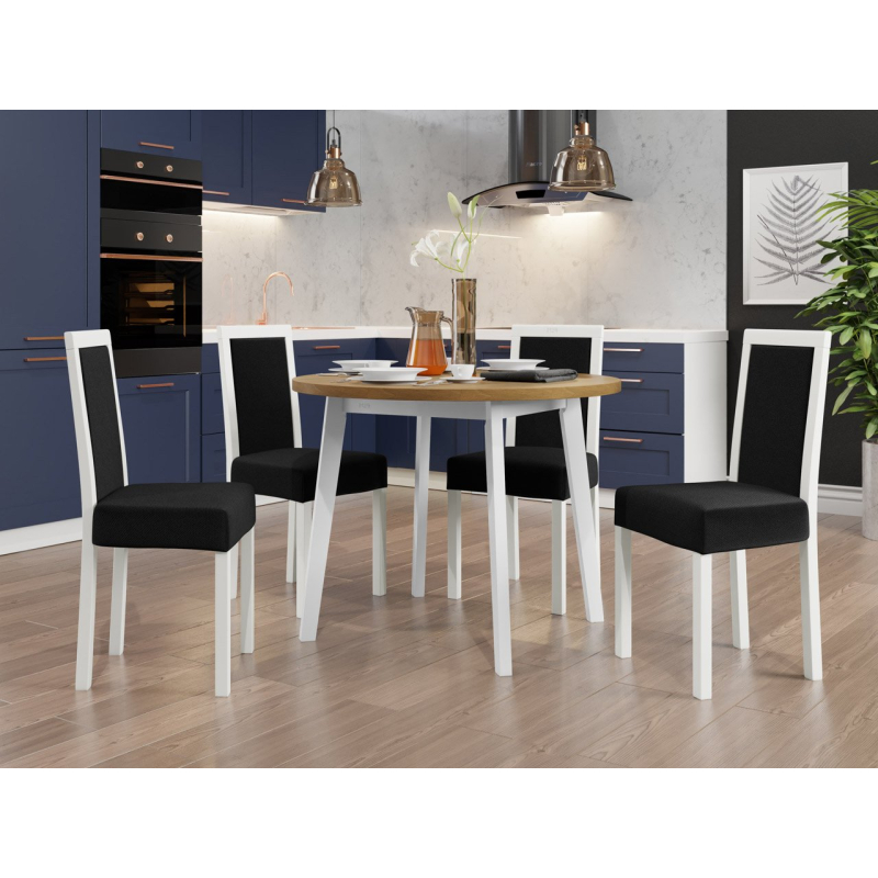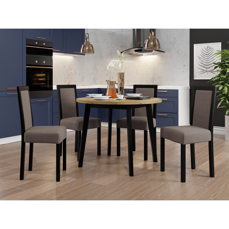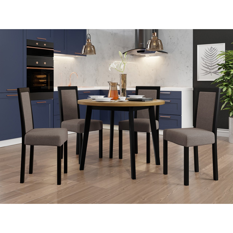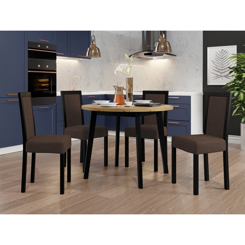 Náš krásný kulatý stůl se čtyřmi elegantními židlemi je ideální volbou pro vaši jídelnu nebo obývací pokoj. Dodá vašemu prostoru jedinečné kouzlo a vytvoří dokonalé místo pro setkání a společné stolování.