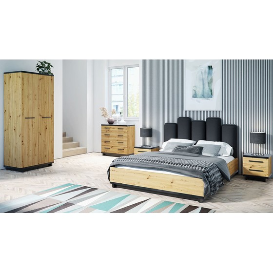 Sada Mins II sestává z prostorné dvoudveřové skříně, komody, dvou nočních stolků a postele s čalouněnou čelní deskou, která je také vybavena úložným prostorem na lůžkoviny a rámem.