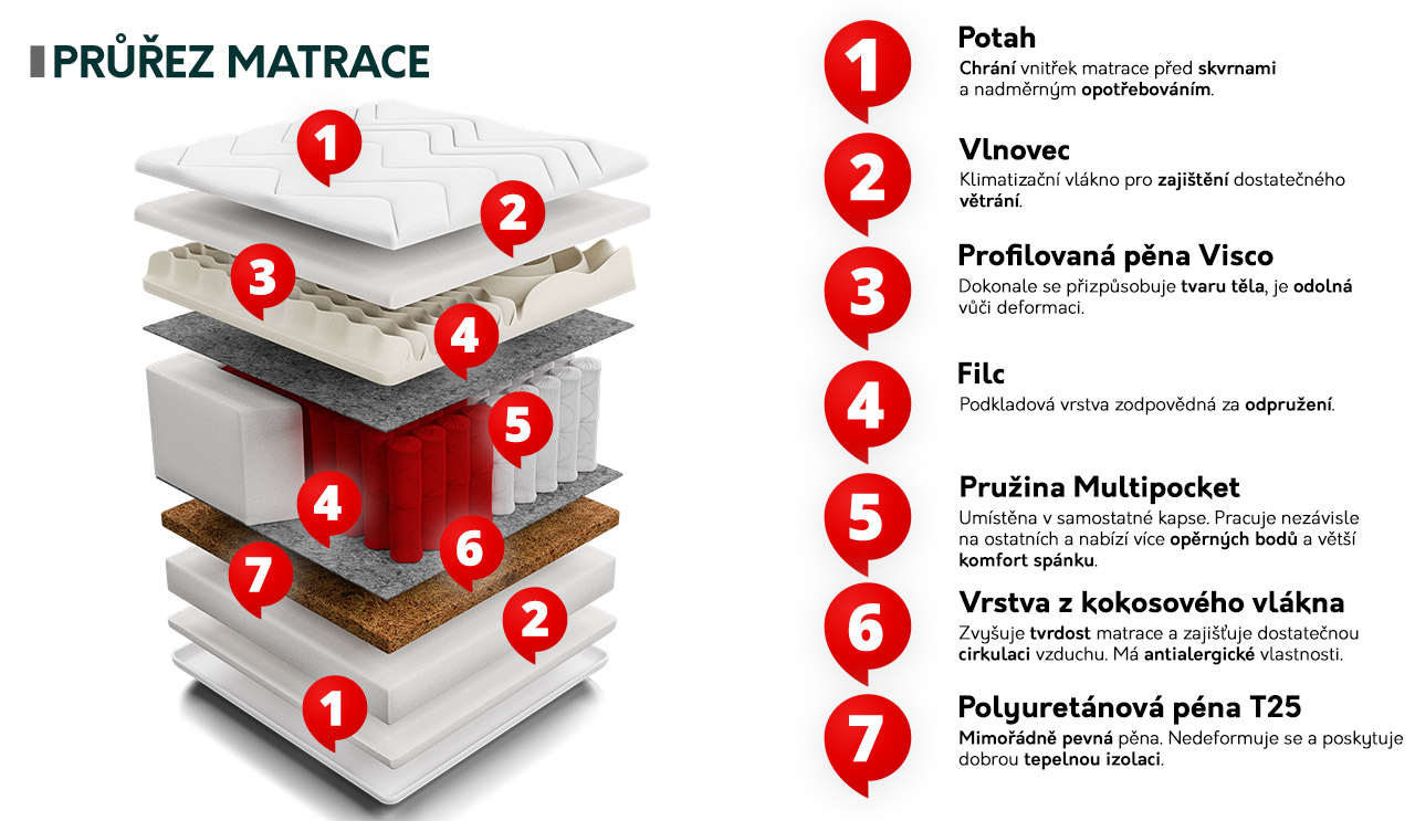 Byl vyroben z kombinace termoelastické a polyuretanové pěny, vícenásobných pružin a kokosové vrstvy, která poskytuje stabilní oporu těla. Matrace má 7 zón tvrdosti, které jsou navrženy tak, aby se dokonale přizpůsobily jednotlivým částem těla.