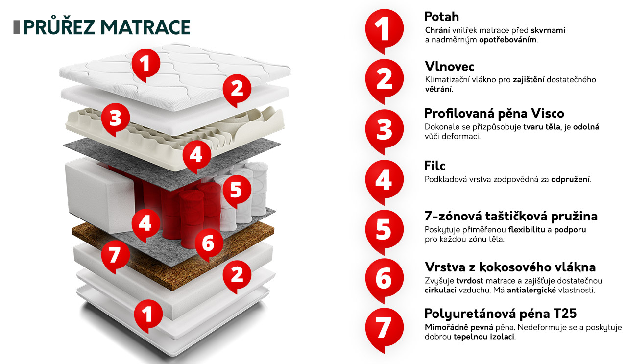 Kromě toho matrace obsahuje vrstvu polyuretanové pěny N2444 R a kokosovú vrtsvu. Vnější část matrace je potahovaná stříbrným zipem. Matrace je navíc součástí modelů s antibakteriálními, antialergickými a ortopedickými vlastnostmi.