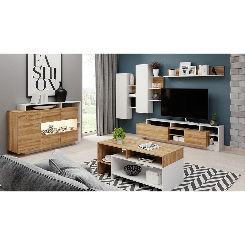 Tato sada se skládá z prostorné televizní skříňky, závěsných skříní a polic, prostorné komody a funkčního konferenčního stolku.