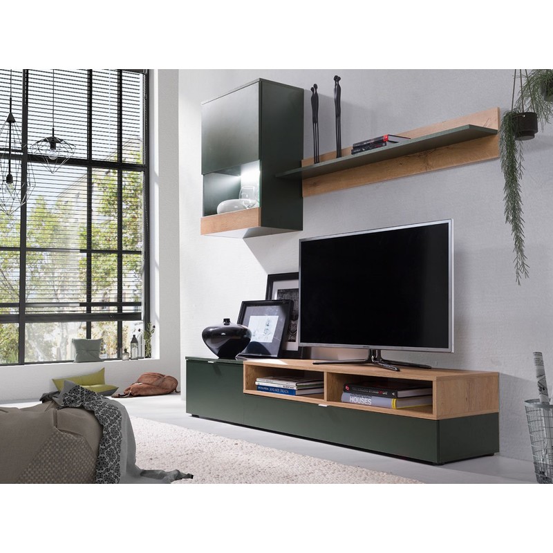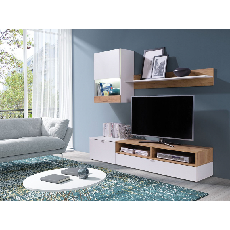 Součástí obývací stěny je TV skříňka se samostatnou policí pro dekodér a reproduktory, závěsná vitrína a police na knihy. K obývací stěně si lze přiobjednat LED osvětlení.