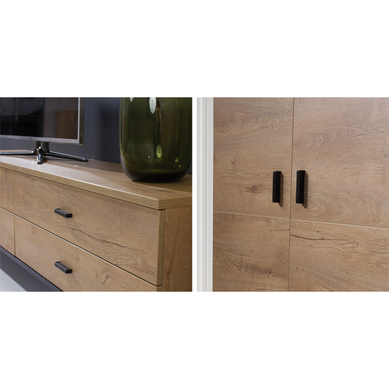 Mallorca je jedinečné vybavení obývacího pokoje. To je činí z nich jednoduchost, s jakou byl každý blok navržen, stejně jako barvy těl a front, které jsou blízké přírodě. Tlumený vzhled byl efektně narušen módními detaily v tmavém interiéru vitrín a závěsné skříňky. Toto řešení zdůrazňuje průmyslový design nábytku do obývacího pokoje. Součástí sady je také televizní skříň s poličkami na knihy a komoda.