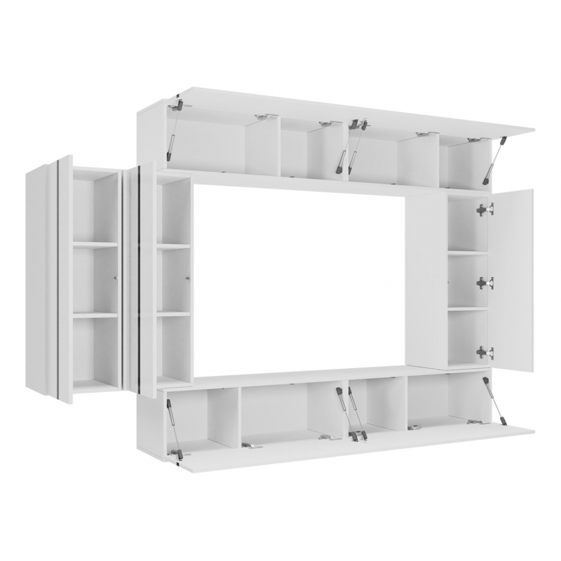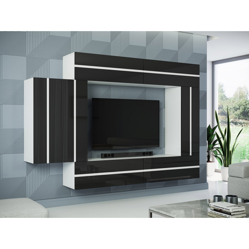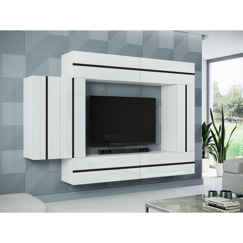 Nástěnná jednotka obsahuje podlouhlé televizní skříňky a závěsné vitríny. Plná čela všech kusů nábytku jsou dekorativní. Na druhou stranu z hlediska funkčnosti usnadňují diskrétní ukládání předmětů nezbytných v obývacím pokoji.