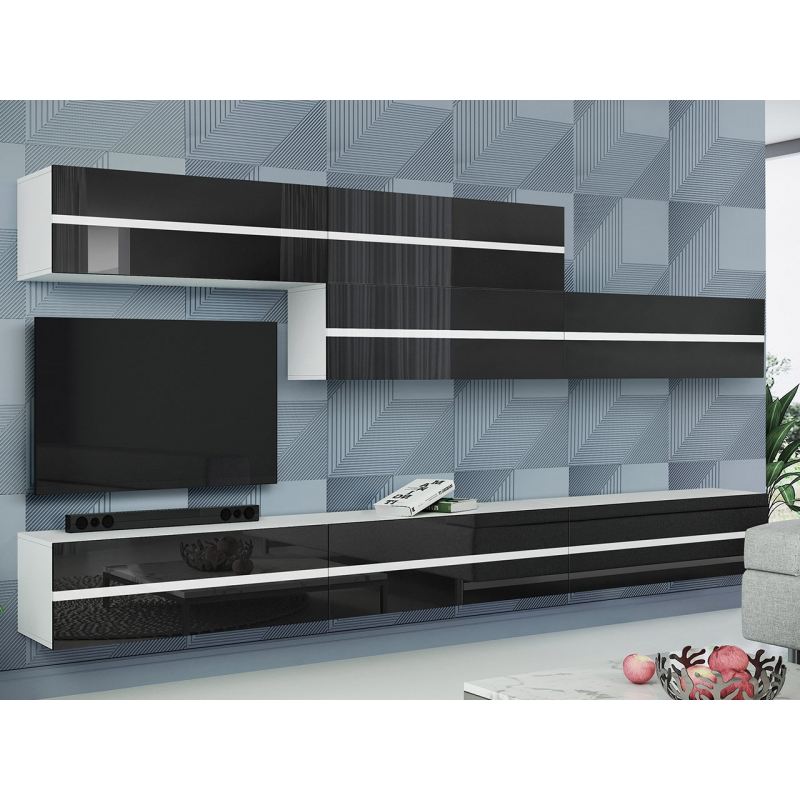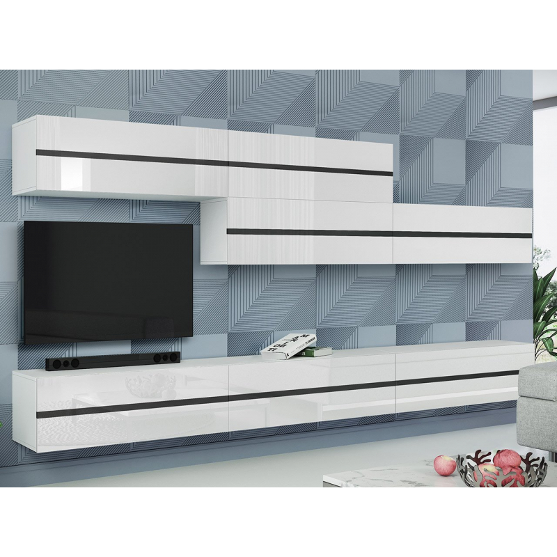 Obývací stěna Marcos IX je ideální pro moderní uspořádání obývacího pokoje. Lesklé čela spolu s dekorativním proužkem dokonale ladí s jakoukoliv barvou stěn a dalšími prvky dekoru.
