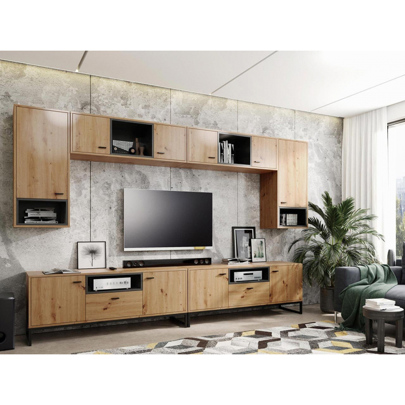 Nábytek do obývacího pokoje Olier VIII osloví lidi, kteří hledají zajímavé a nová řešení. V případě této soupravy si zvláštní pozornost zaslouží originální uspořádání nábytku, který zdobí celou stěnu. Jednoduchá forma nábytku dokonale zapadá do použitých barev a doplňků v podobě úchytek a kovových konstrukcí, které nahrazují tradiční nohy.