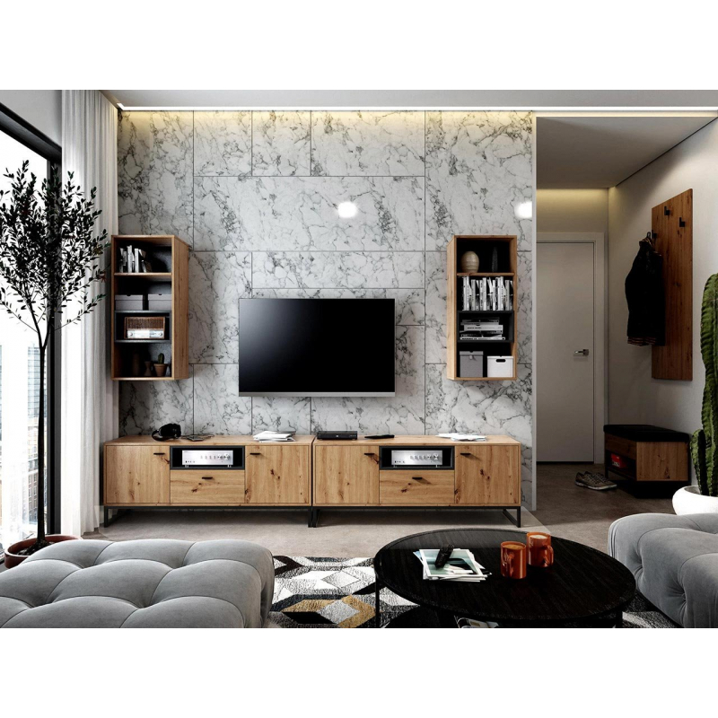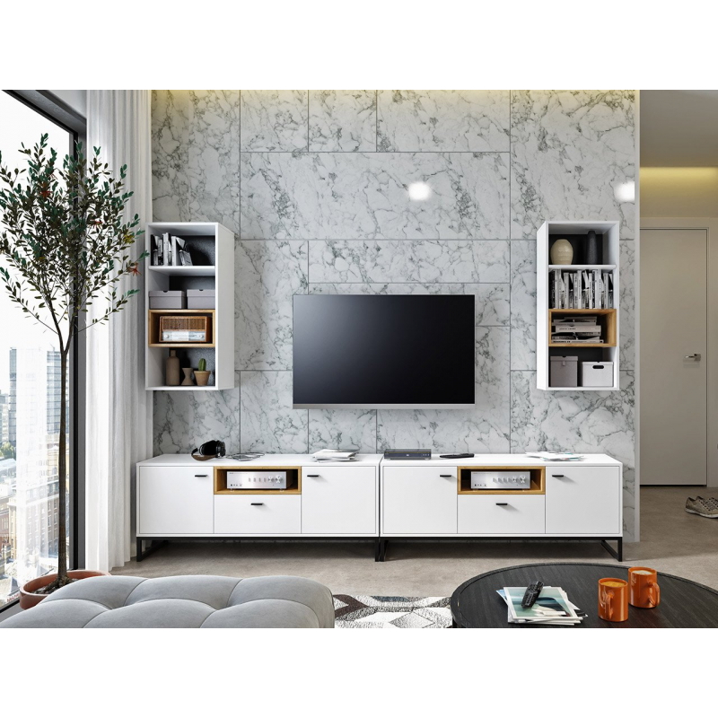 V soupravě Olier IX najdete dvě šikovné televizní skříňky, které vám pomohou uspořádat věci a vystavit vaše elektronické zařízení, a dvě závěsné police, které jsou dokonalým místem pro dekorace nebo knihy.