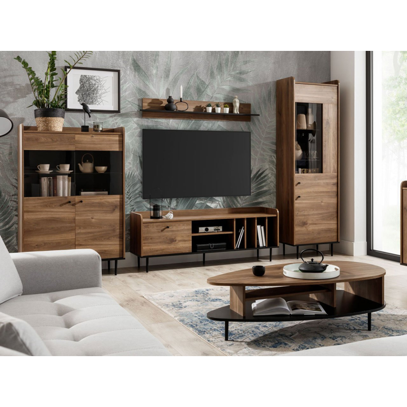 Prezentovaný nábytek do obývacího pokoje se skládá z pěti prvků. První z nich je skříň RTV s mnoha přihrádkami, např. na DVD nebo knihy, poličkou na dekodér a skříňkou typu bar.
