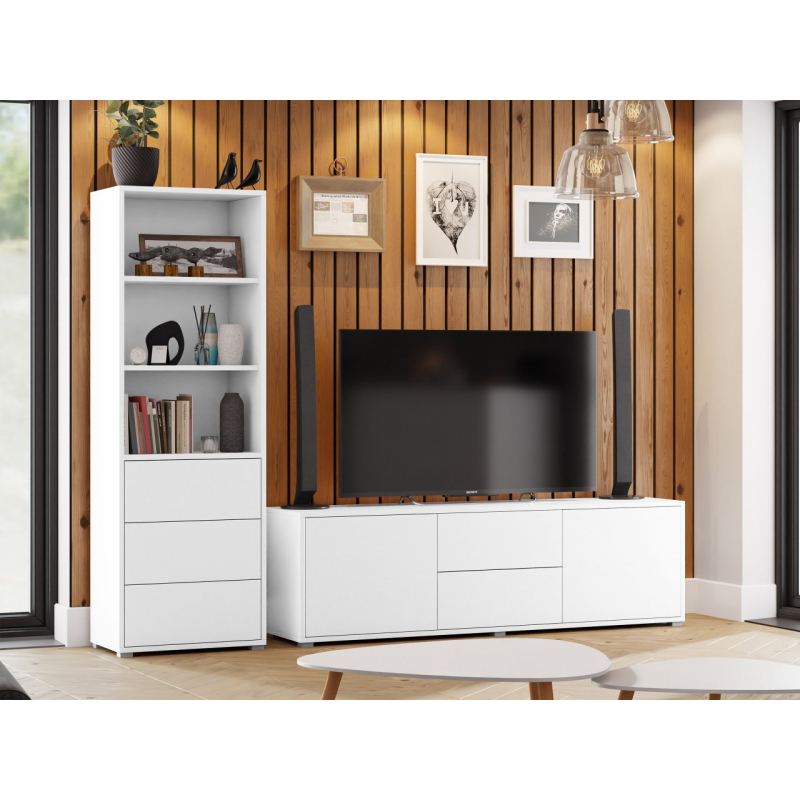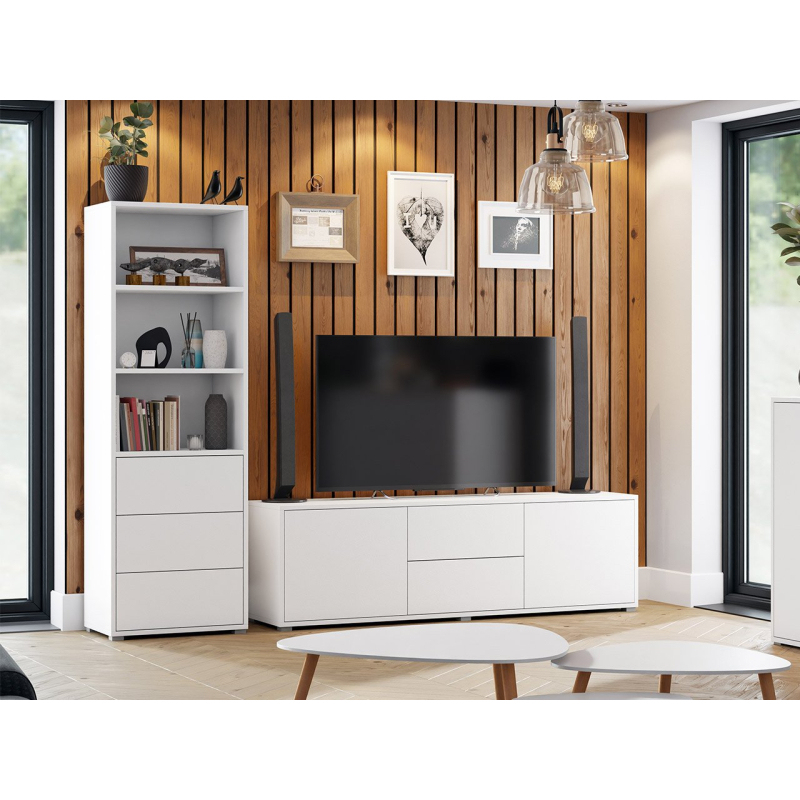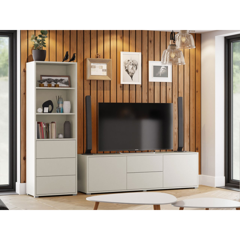 Moderní vzhled sestavy pokojového nábytku Alekto IV dokonale ladí s interiérem obývacího pokoje. Ke skandinávskému a minimalistickému dekoru ladí jak jednoduché tvary masivů, tak i dvířka bez úchytek. Výhodou jsou také světlé barvy nábytkové sestavy. V praxi prosvětlí interiér a přidá také trochu optického zvětšení.