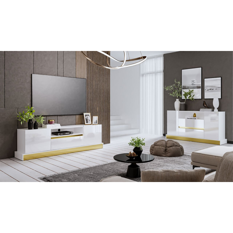 Prezentovaný pokojový nábytek je stylovou kombinací se zlatými prvky, které zdůrazňují charakteristický základ. Sestava obsahuje komodu a TV skříňku. Poskytují prostor pro nejnutnější věci v podobě polic a zásuvek. Budou také vynikajícím základem pro dekorace. Nábytek je bez úchytek a otevírá se díky tomu, že fronty mírně vyčnívají nad vrchní desku.
