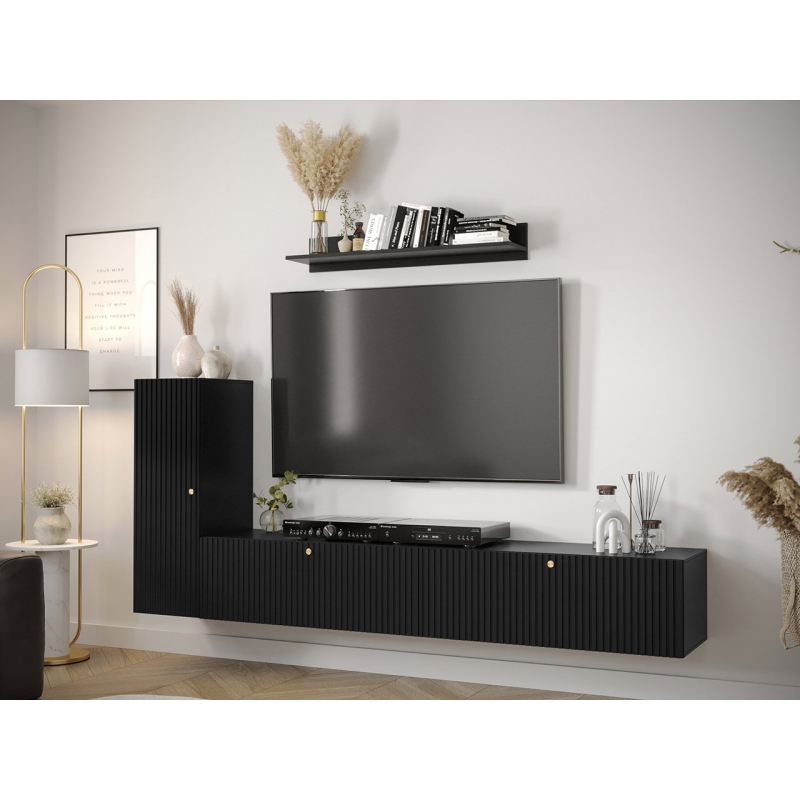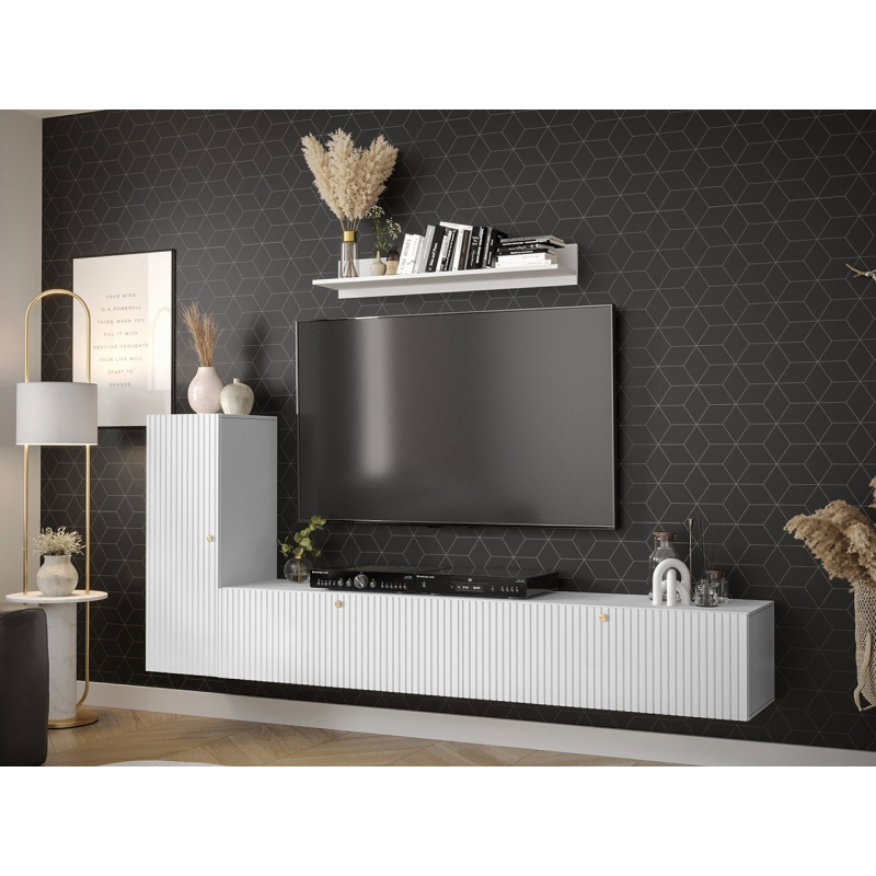 Výhodou nástěnné jednotky je charakteristické frézování čel. Na kouzlu jí dodávají symetrické drážky, které využívá celý obývací pokoj. Každá ze skříněk je navíc ozdobena malým úchytem. Tento vkusný detail dokonale ladí se vzhledem nástěnné jednotky.