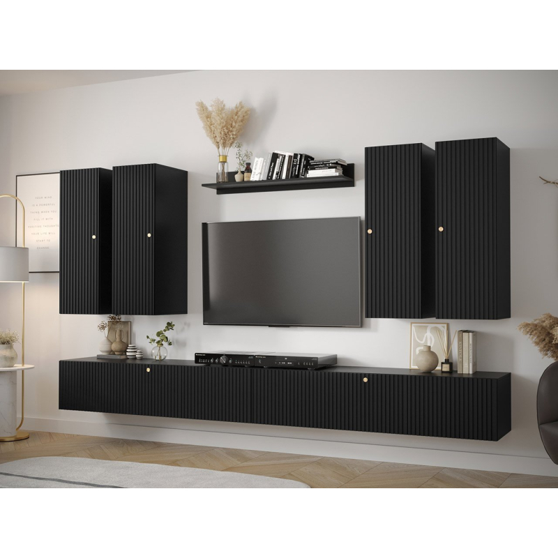 Nástěnná skříň Towiro Slim I 4 je sestava, která nejen zorganizuje váš obývací pokoj, ale stane se i jeho jedinečnou ozdobou. Charakteristickými prvky nábytku jsou drážkovaná čela a zlaté doplňky, které dodávají eleganci. Skříňky jsou závěsné, což zdůrazňuje moderní charakter nástěnné jednotky.