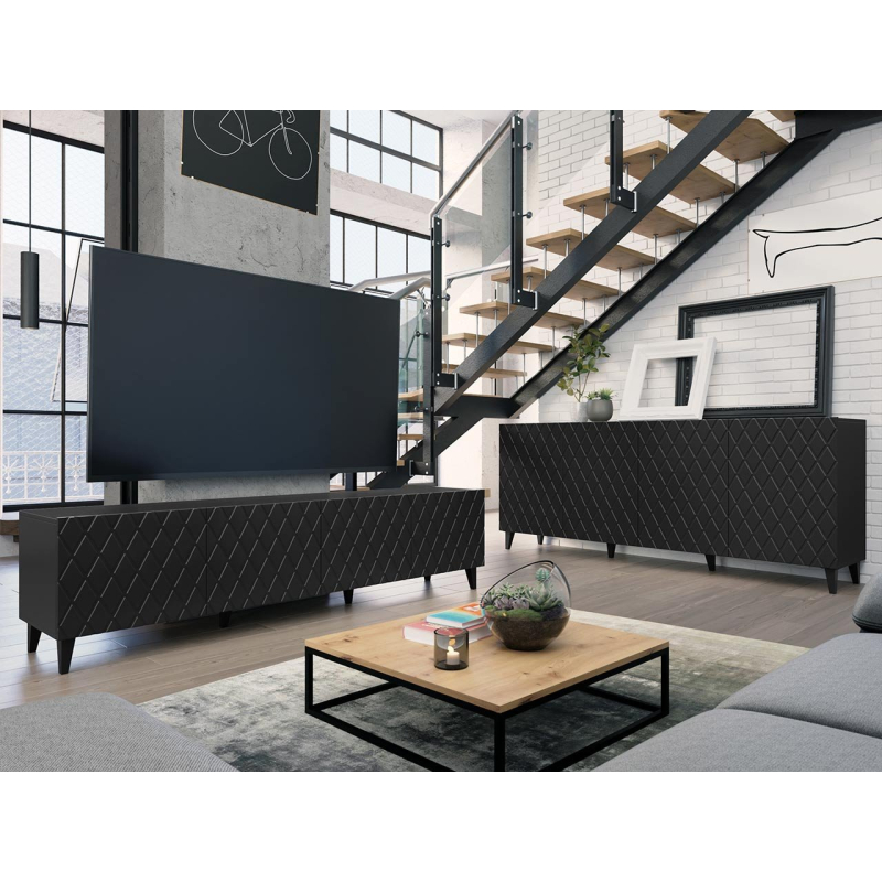 Sestava nábytku do obývacího pokoje Deziko obsahuje prostornou 4-dveřovou komodu. Připravili jsme zde také TV skříňku. Udržovaný ve stylu odpovídajícím komodě vypadá tento kus nábytku velmi působivě. Výhodou TV skříňky je také prostorný interiér - skvělý úložný prostor pro příslušenství potřebné v zóně domácího kina.