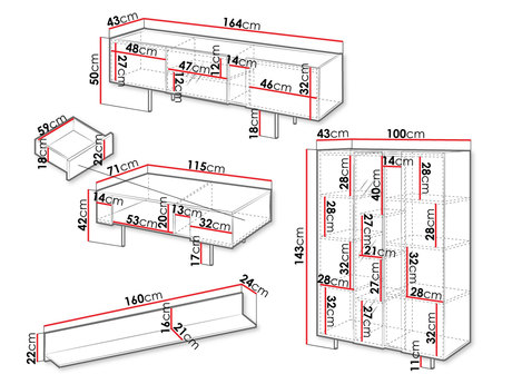 - šířka: 164 cm, výška: 50 cm, hloubka: 43 cm,