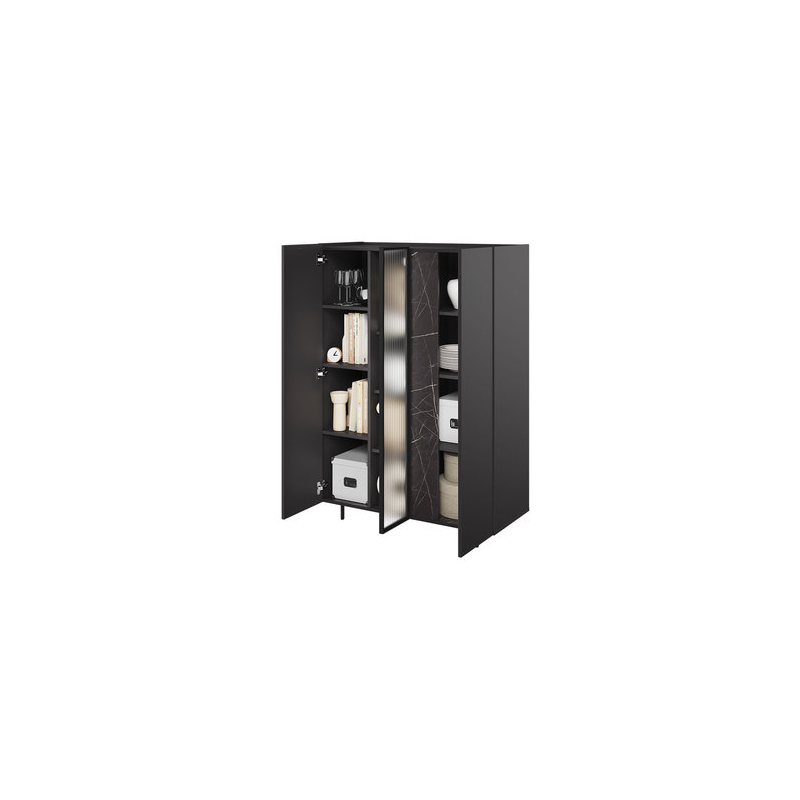 Sestava nábytku do obývacího pokoje je kompozice plná elegance, praktičnosti a sofistikovanosti. Prvky v mramorovém tématu dodávají celku luxus a prestiž. Na druhé straně subtilní kovové nohy vnášejí poněkud industriálního charakteru.