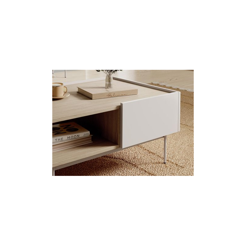 Celek doplňuje konferenční stolek se šuplíky. Poskytuje prostor pro podávání kávy nebo čaje, jakož i zónu pro odkládání drobností, jako jsou dálkové ovladače nebo oblíbené časopisy. Nábytek do obývacího pokoje Coriko I vdechne život vašemu bytu!