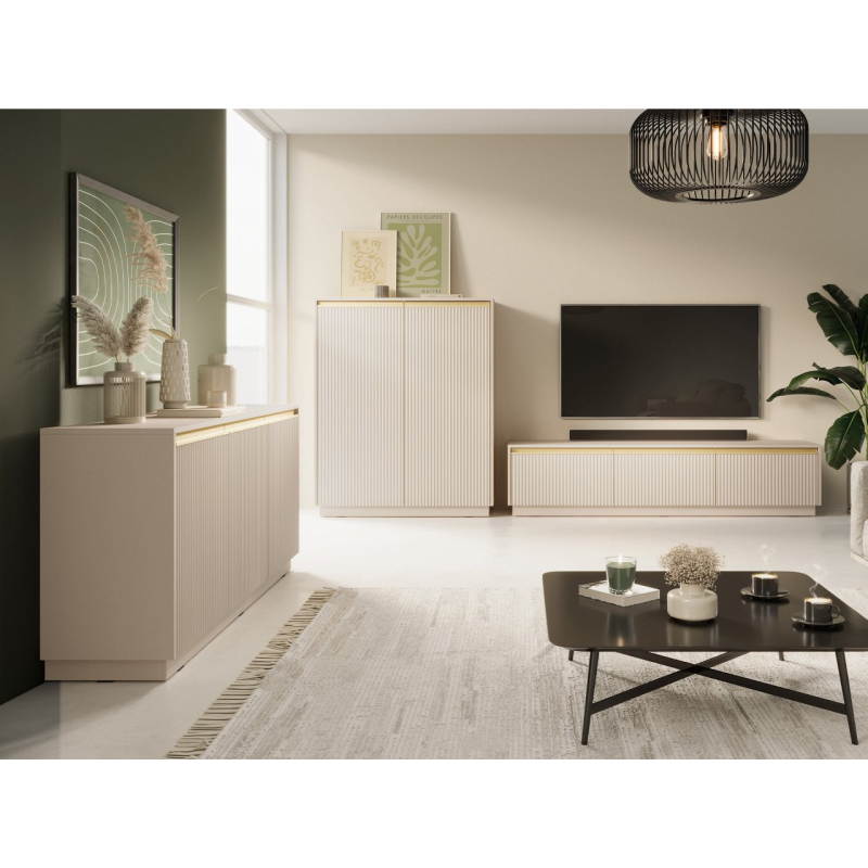 Souprava se skládá ze tří prvků. Jedná se o dvě skříňky různých velikostí a TV skříňku. S tímto setem vytvoříte jak TV zónu, tak si pořídíte praktické odkládací přihrádky. Vrchy jednotlivých prvků poskytují skvělý prostor pro vystavení dekorací. Nábytek do obývacího pokoje v praktické sestavě je způsob, jak ve vašem interiéru vytvořit soudržnost a harmonii.